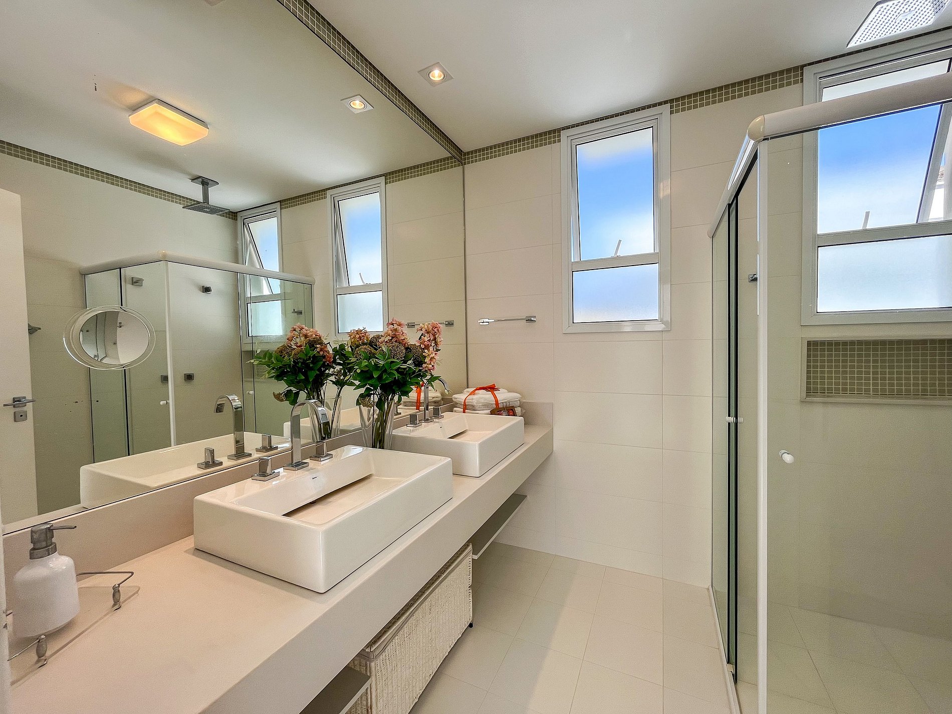 - No andar superior são 4 suítes, todas com varanda, ar-condicionado, cortina e uma sala de TV e convívio.