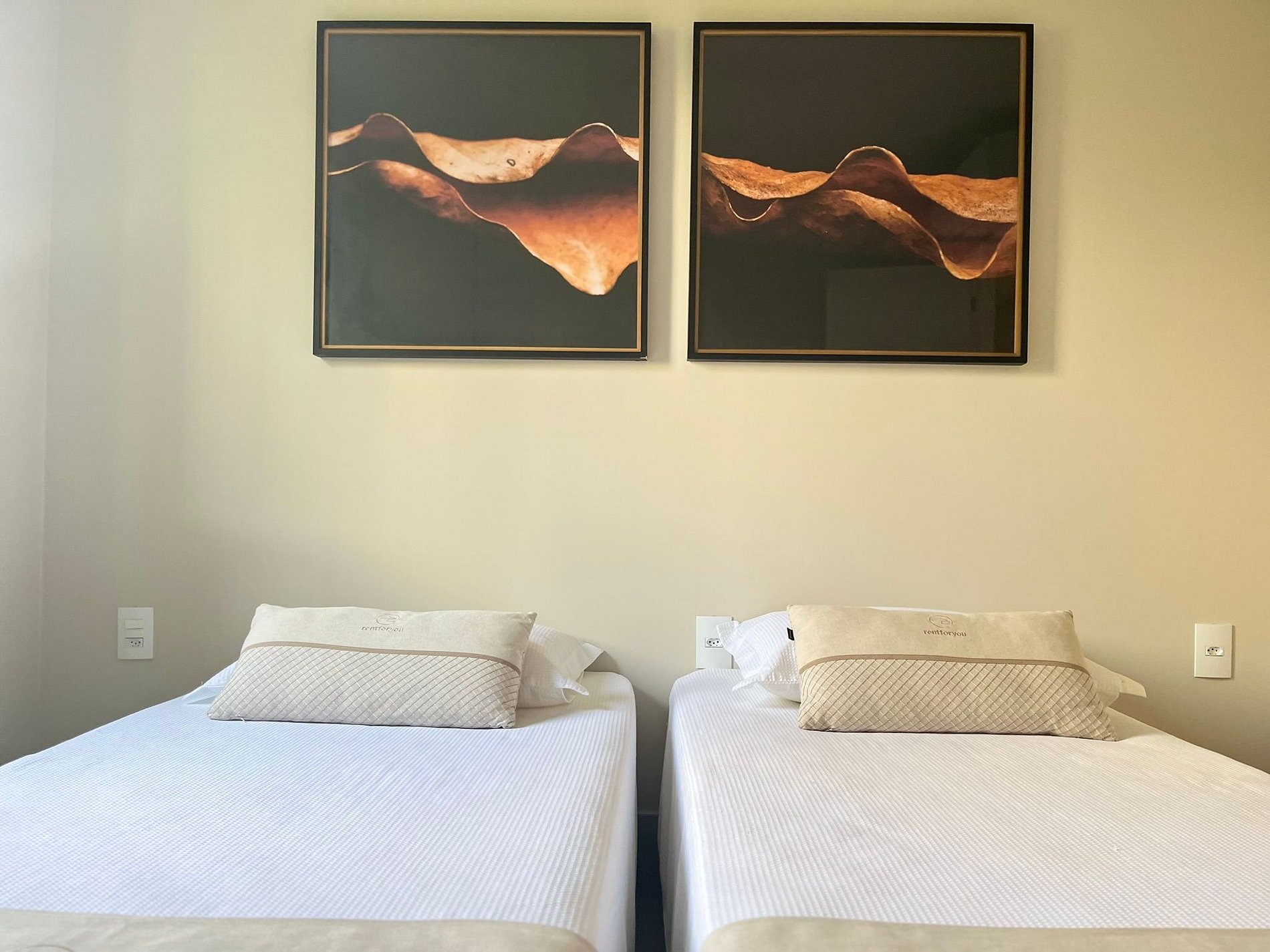 Camas preparadas com lençóis padrão hotelaria, toalhas de banho, rosto e praia, toalhas de piso e cobertores.