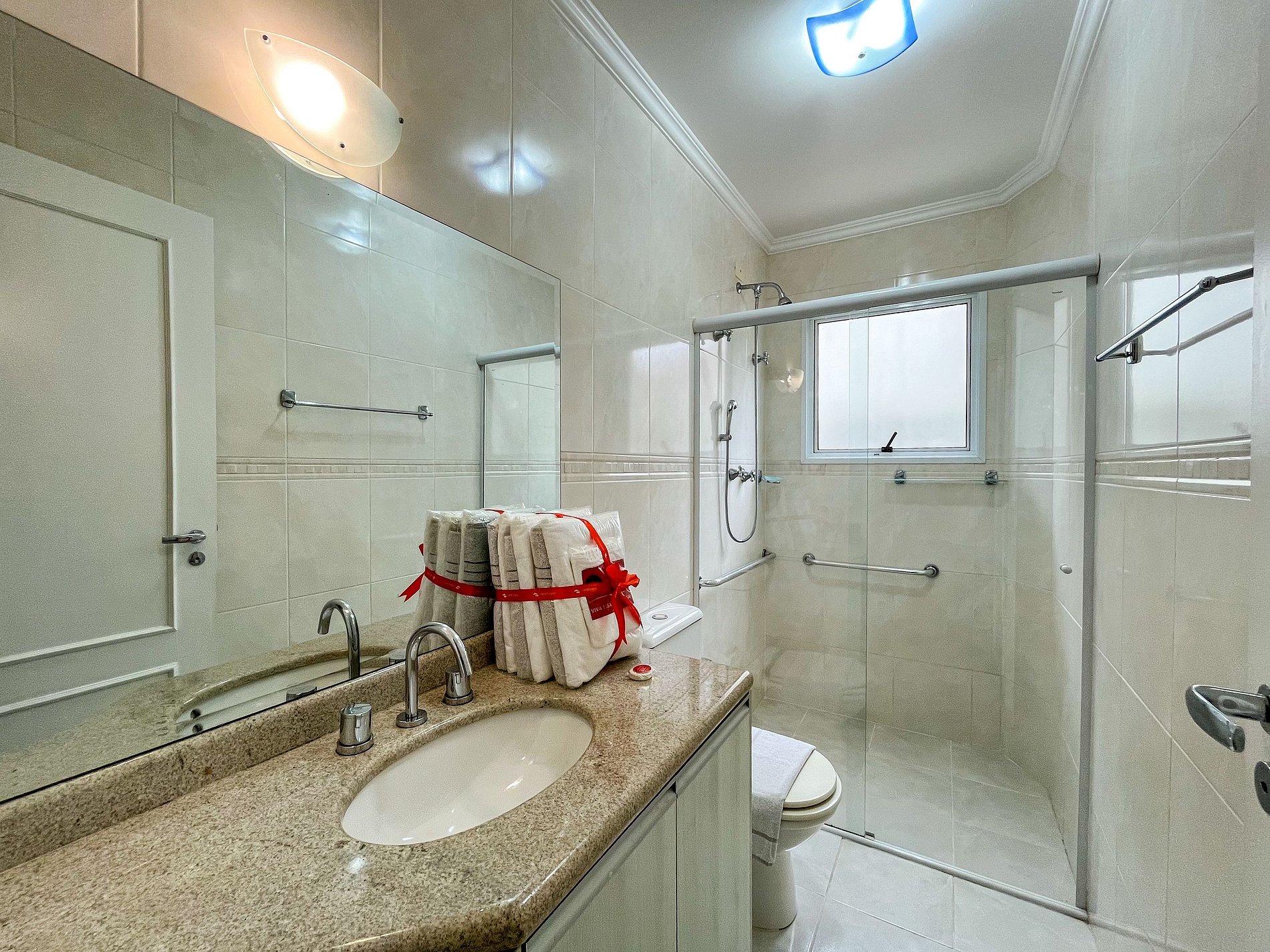 Camas preparadas com lençóis padrão hotelaria, toalhas de banho, rosto e praia, toalhas de piso e cobertores. Inclui amenidades exclusivas — Toilette, Gourmet e Café — detalhes que transformam sua estadia em uma verdadeira experiência de conforto.