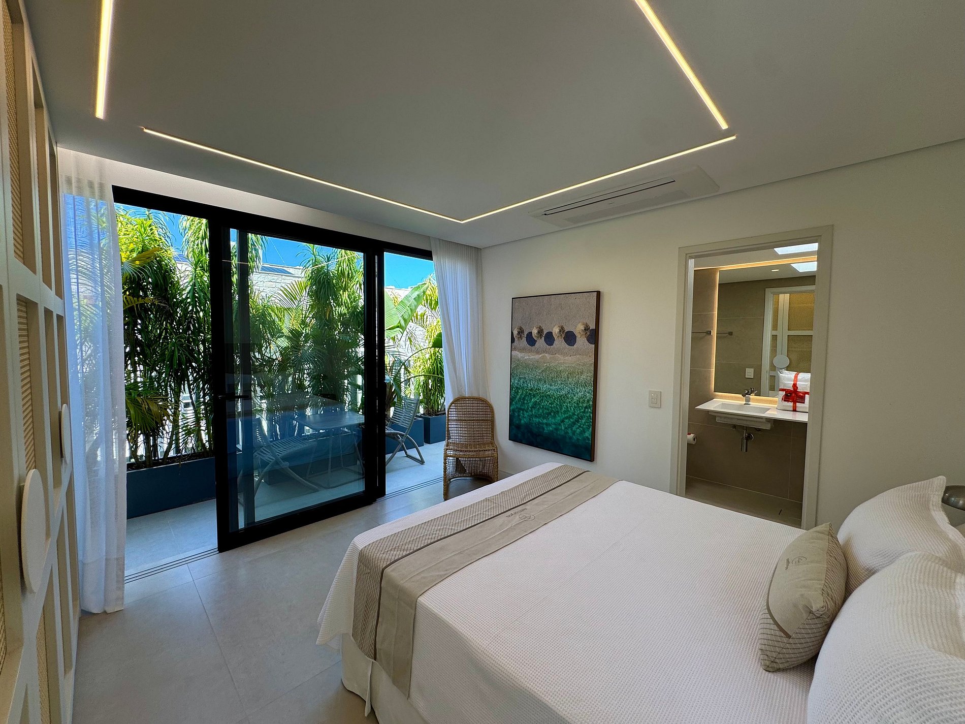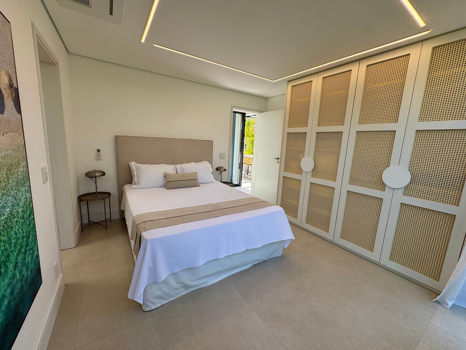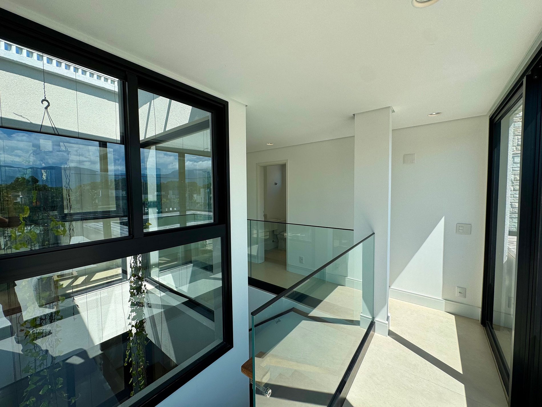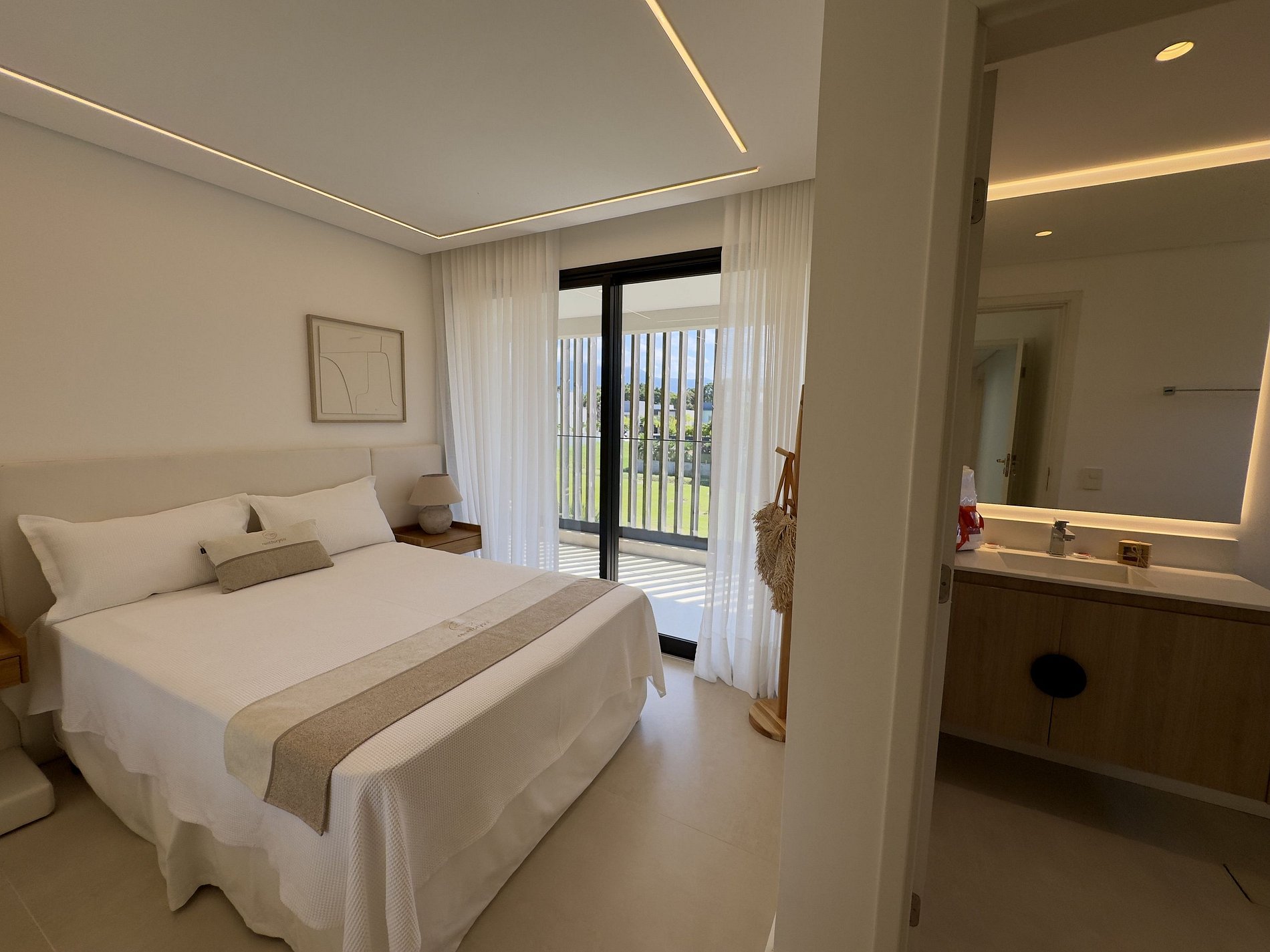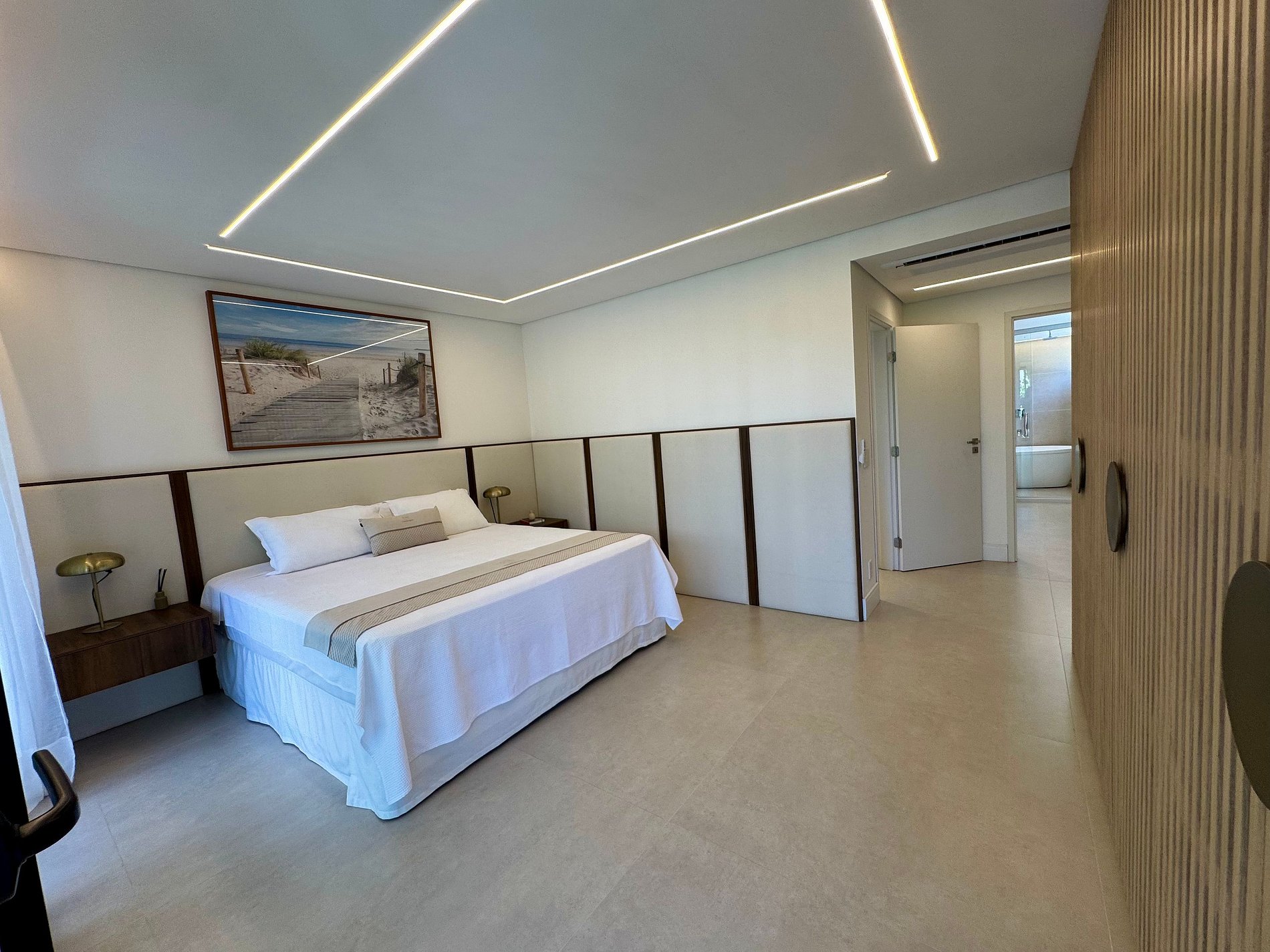 PAVIMENTO SUPERIOR – Suítes em perfeita harmonia com a natureza e o conforto. O andar abriga quatro das cinco suítes, incluindo a master, com banheira. Todos os ambientes foram projetados pelo Studio Mariana Crego – Arquitetura e Interiores, combinando design contemporâneo, sustentabilidade e luxo em sua forma mais pura.