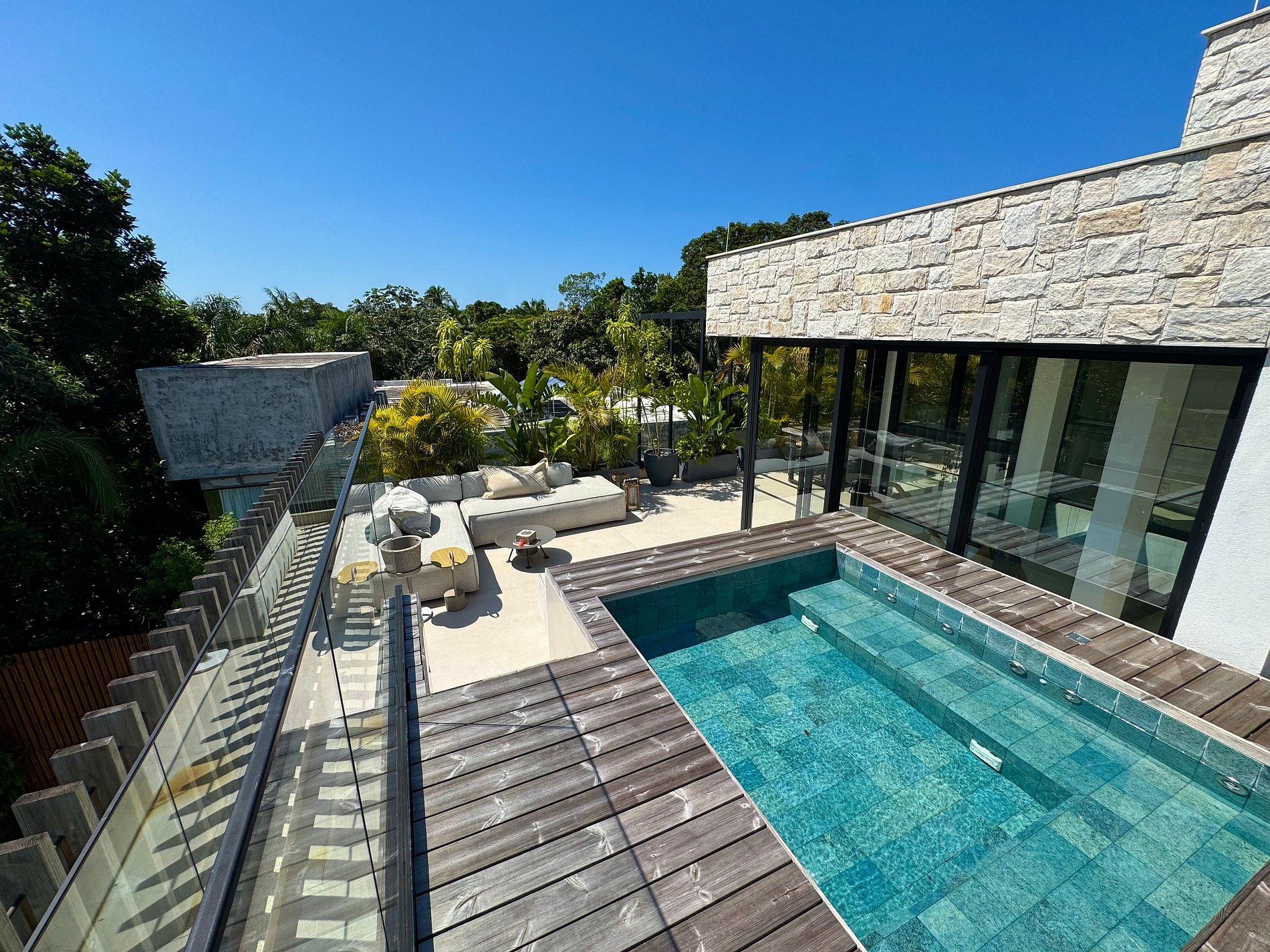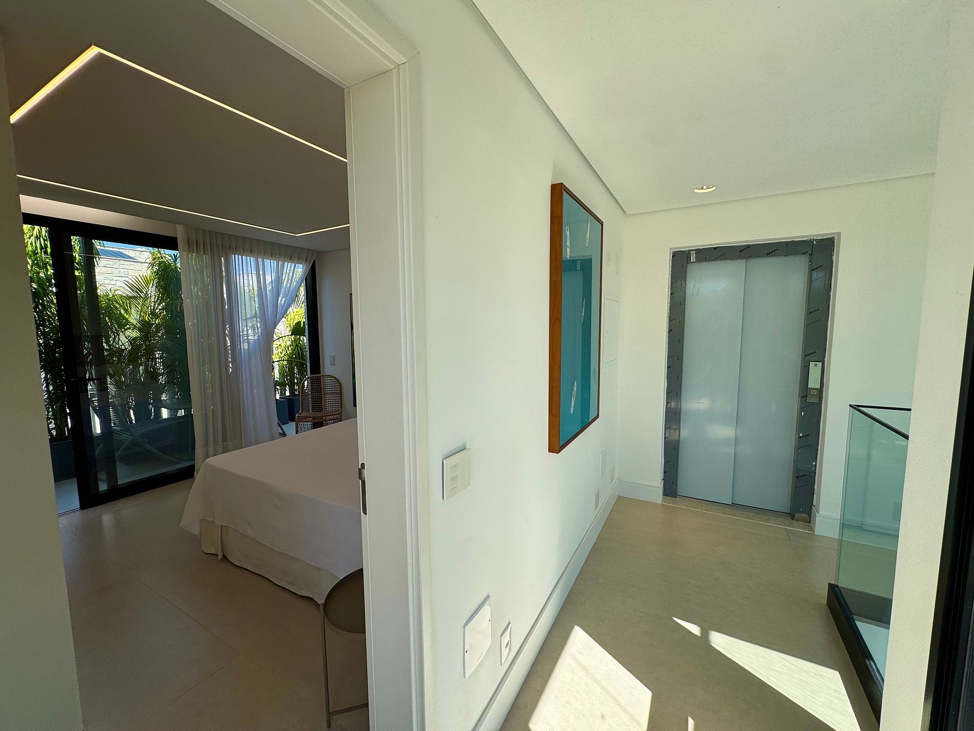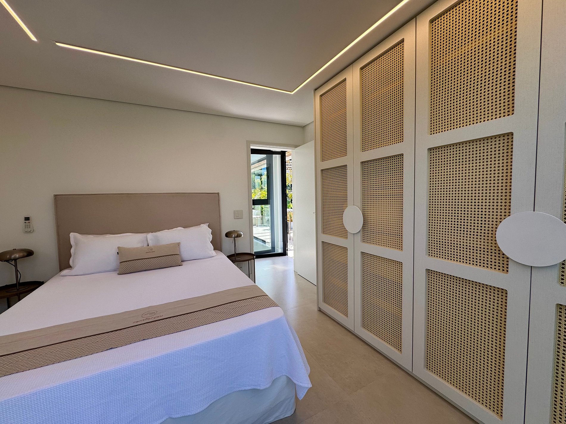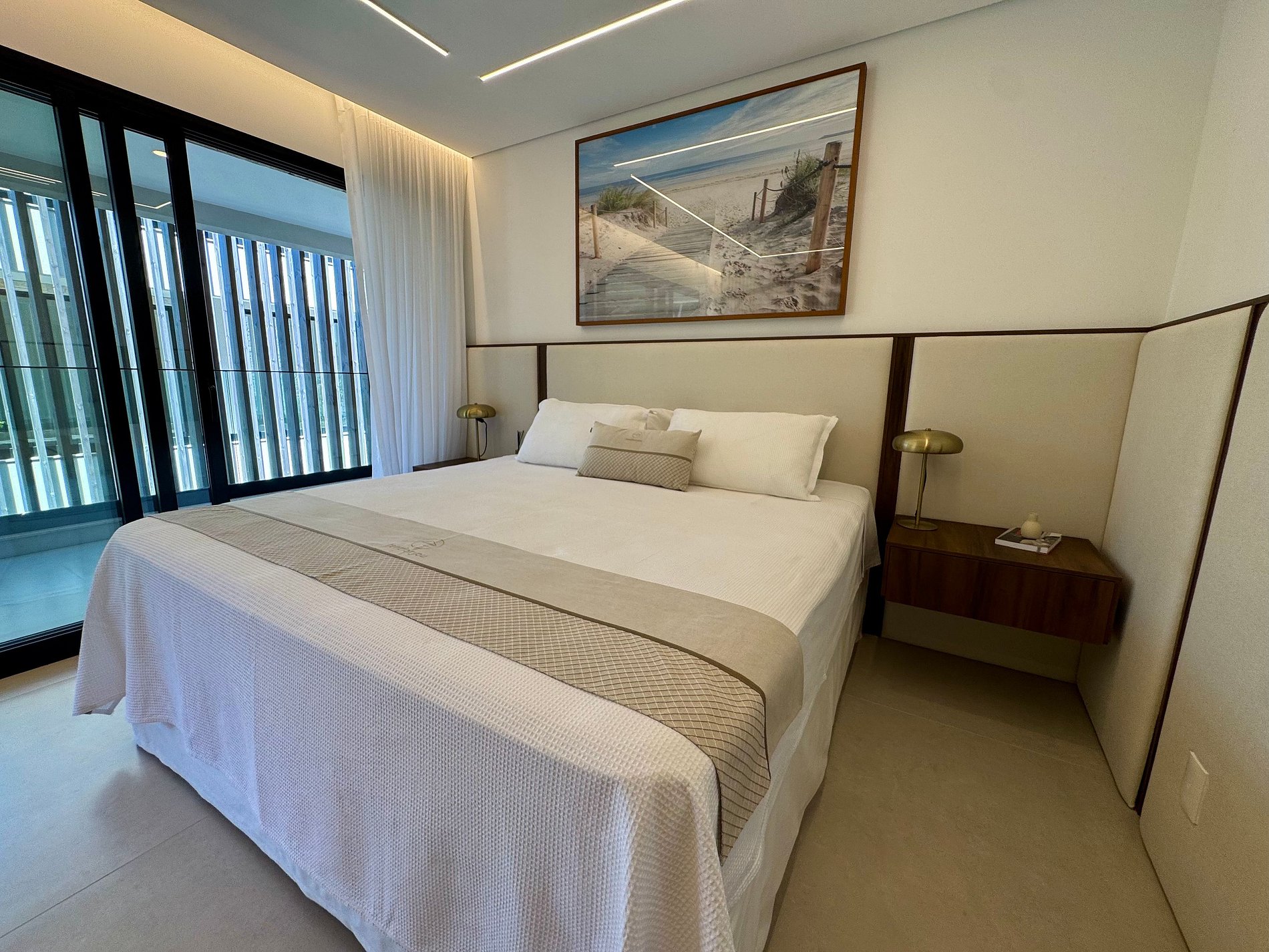 PAVIMENTO SUPERIOR – Suítes em perfeita harmonia com a natureza e o conforto. O andar abriga quatro das cinco suítes, incluindo a master, com banheira. Todos os ambientes foram projetados pelo Studio Mariana Crego – Arquitetura e Interiores, combinando design contemporâneo, sustentabilidade e luxo em sua forma mais pura.