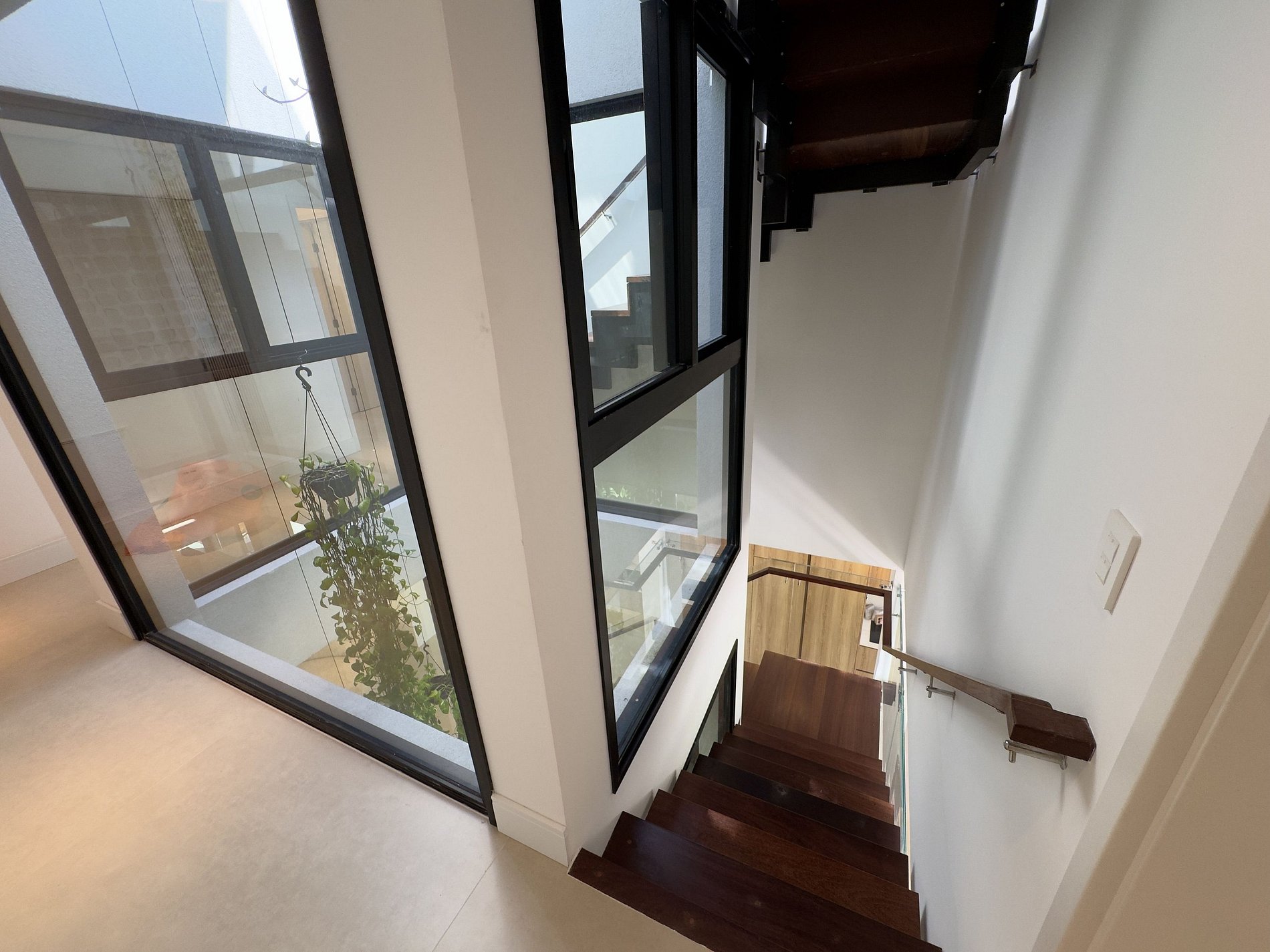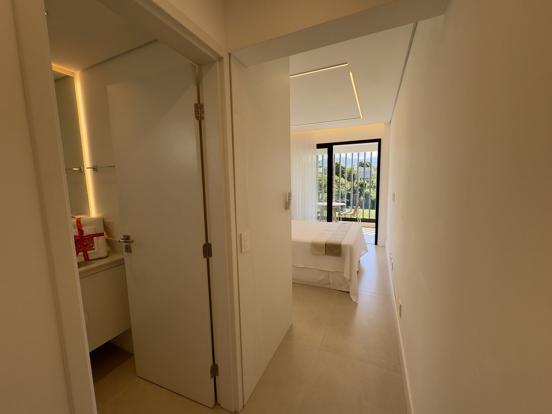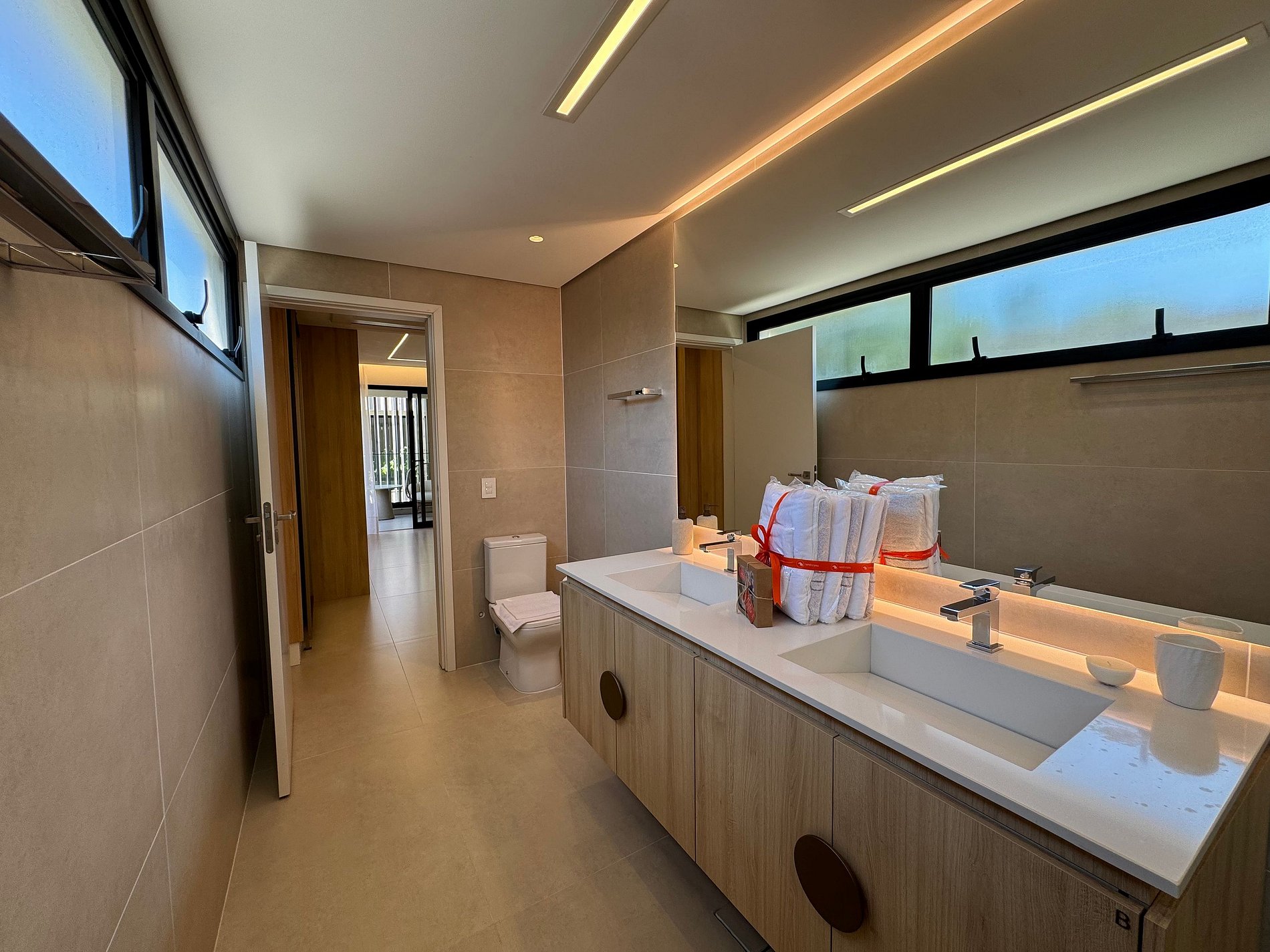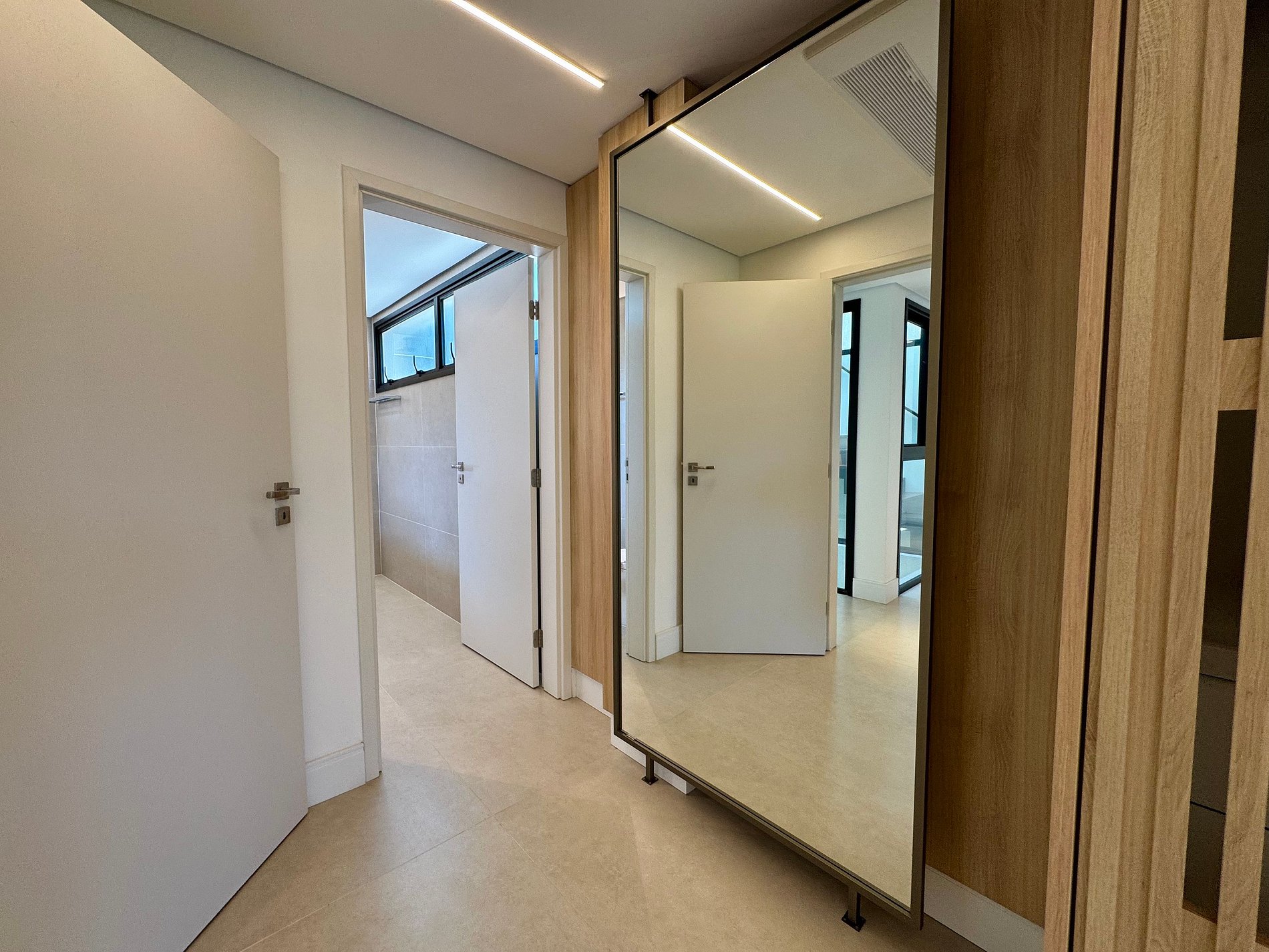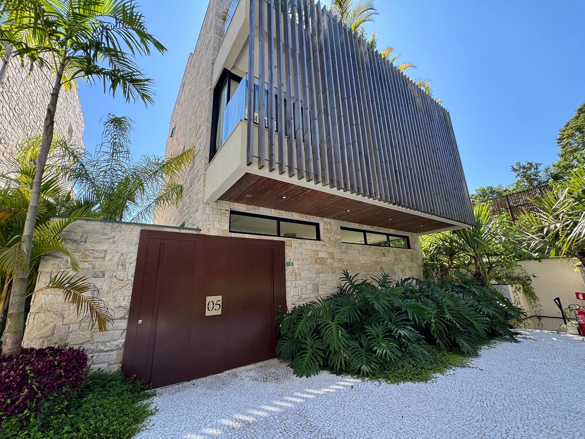 PAVIMENTO SUPERIOR – Suítes em perfeita harmonia com a natureza e o conforto. O andar abriga quatro das cinco suítes, incluindo a master, com banheira. Todos os ambientes foram projetados pelo Studio Mariana Crego – Arquitetura e Interiores, combinando design contemporâneo, sustentabilidade e luxo em sua forma mais pura.
