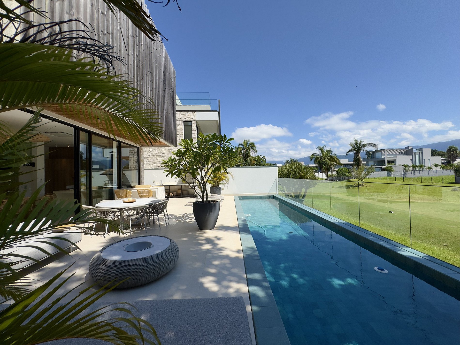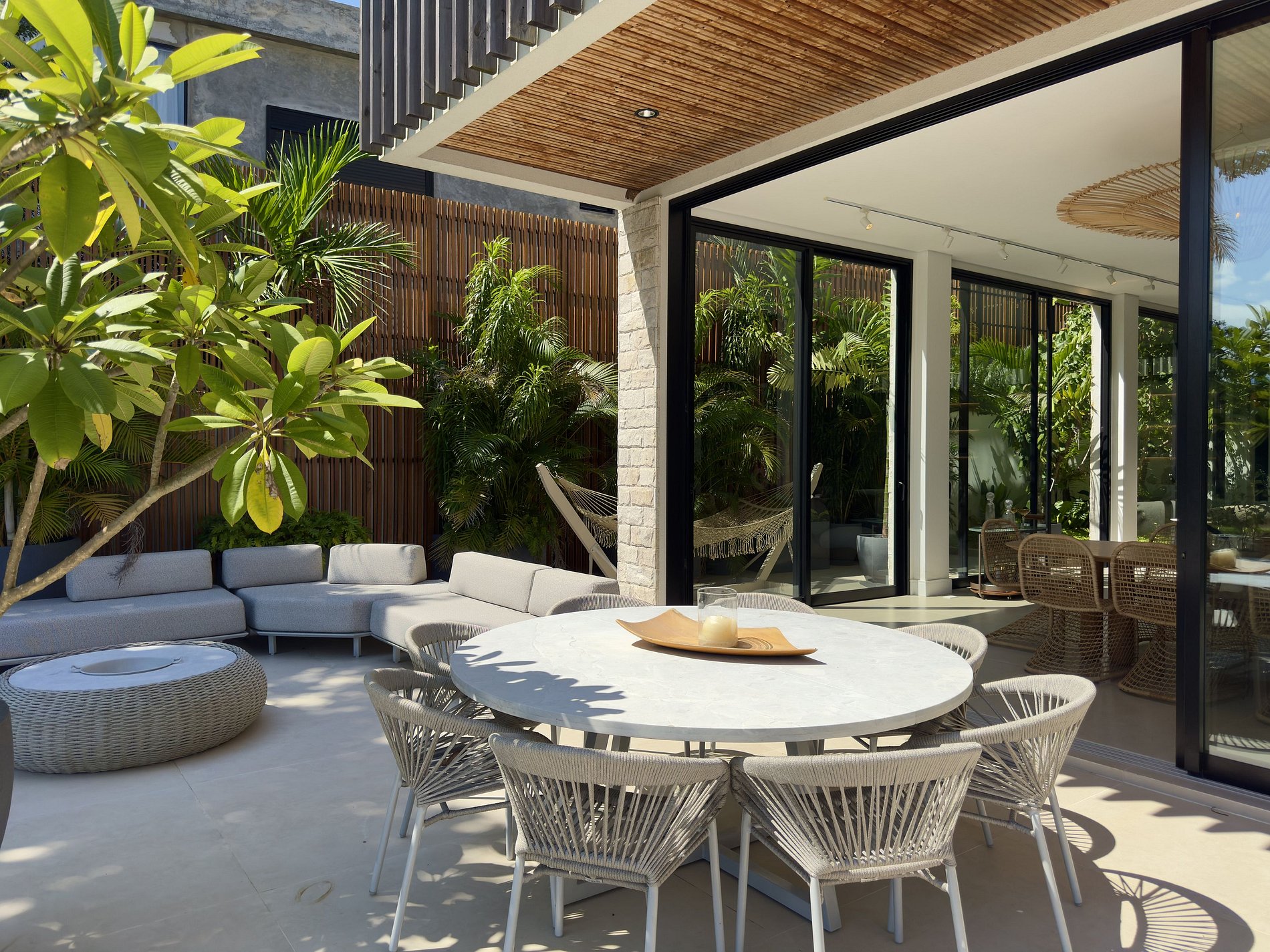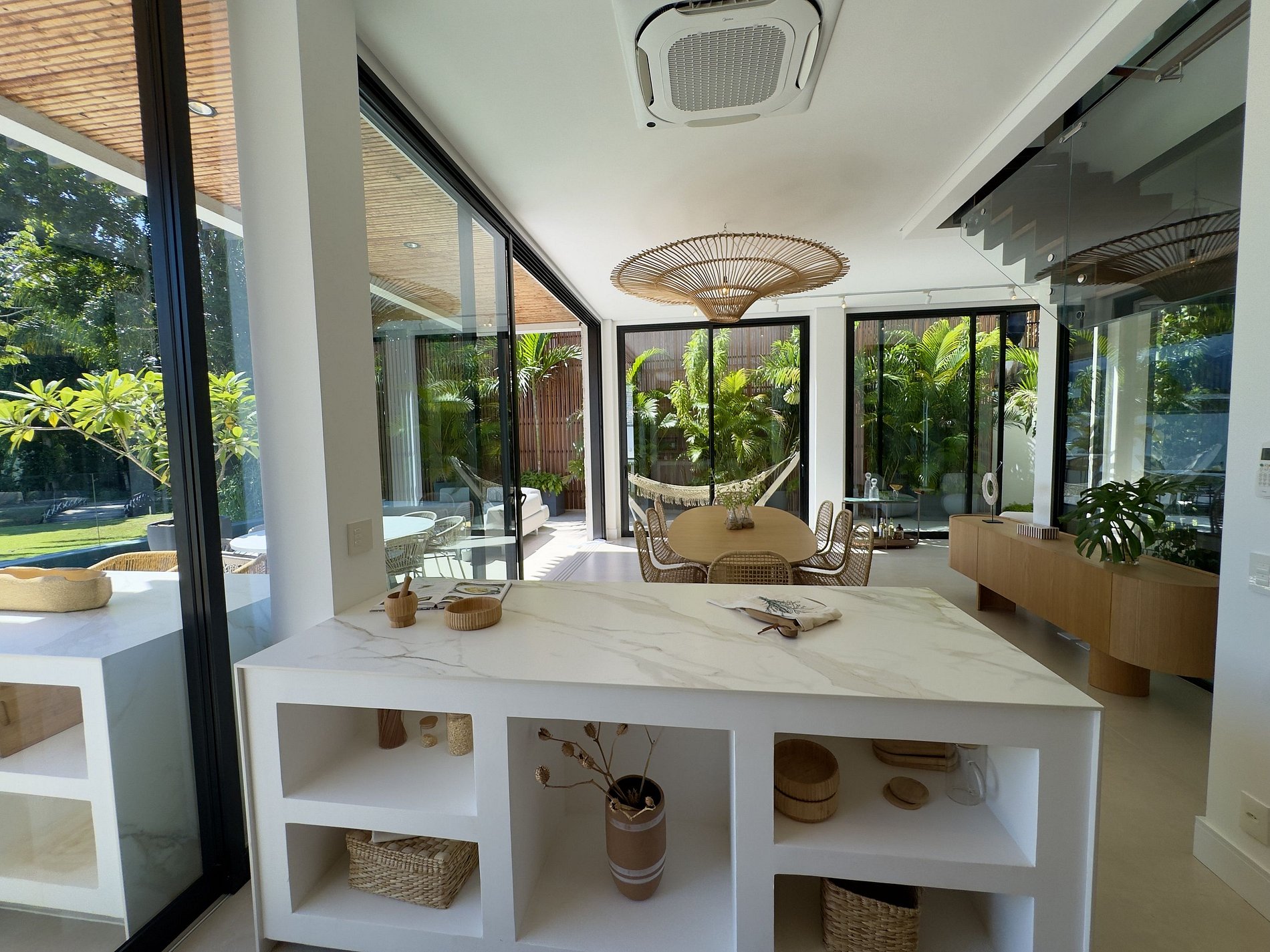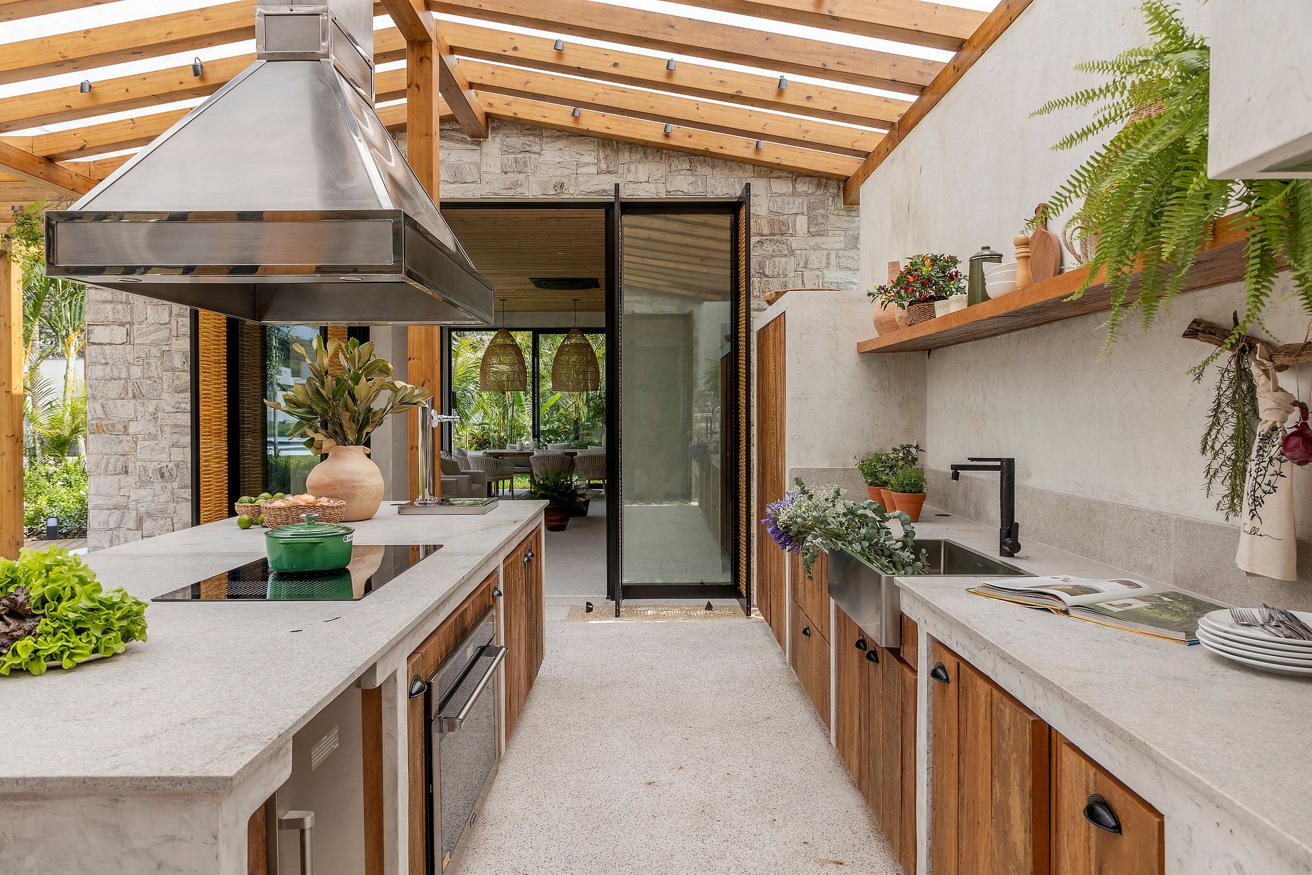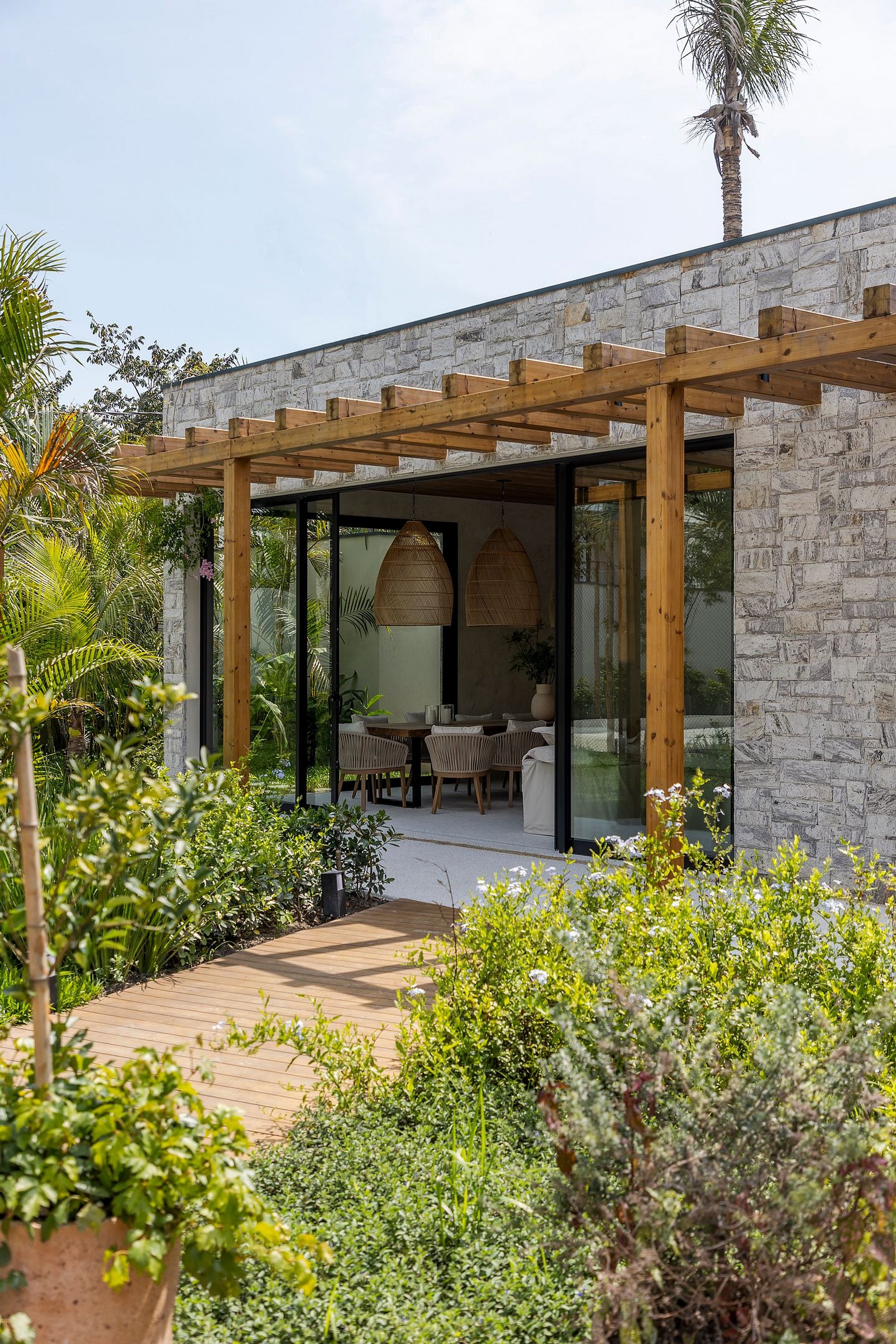 O paisagismo, assinado por Gil Fialho Paisagismo, BIU e Carla Oldemburg, apresenta um jardim sensorial com espécies que florescem em diferentes estações — um convite a apreciar a natureza o ano todo. O projeto inclui ainda árvores frutíferas e horta, pensado para proporcionar relaxamento em conexão com a natureza e a praia.