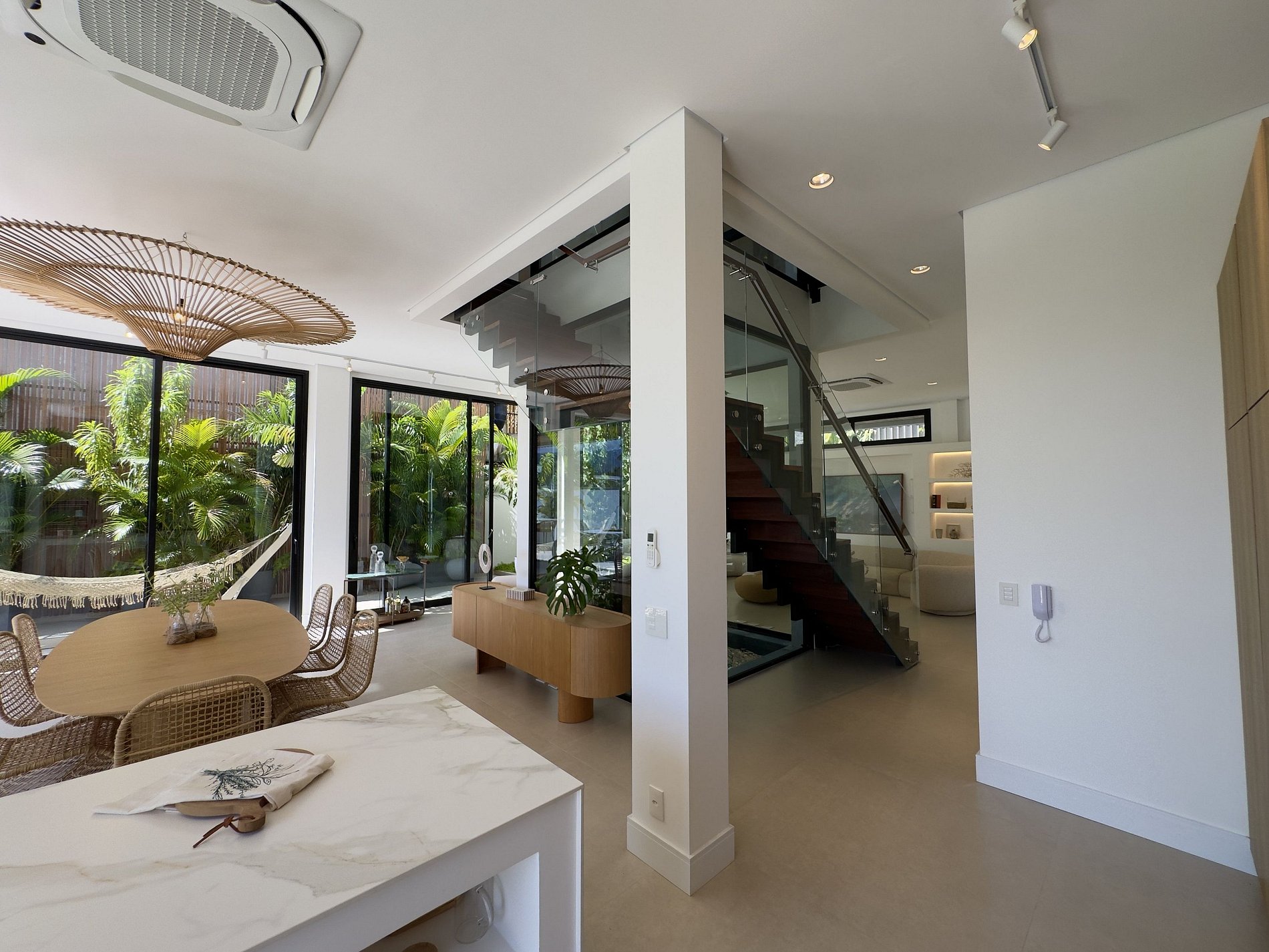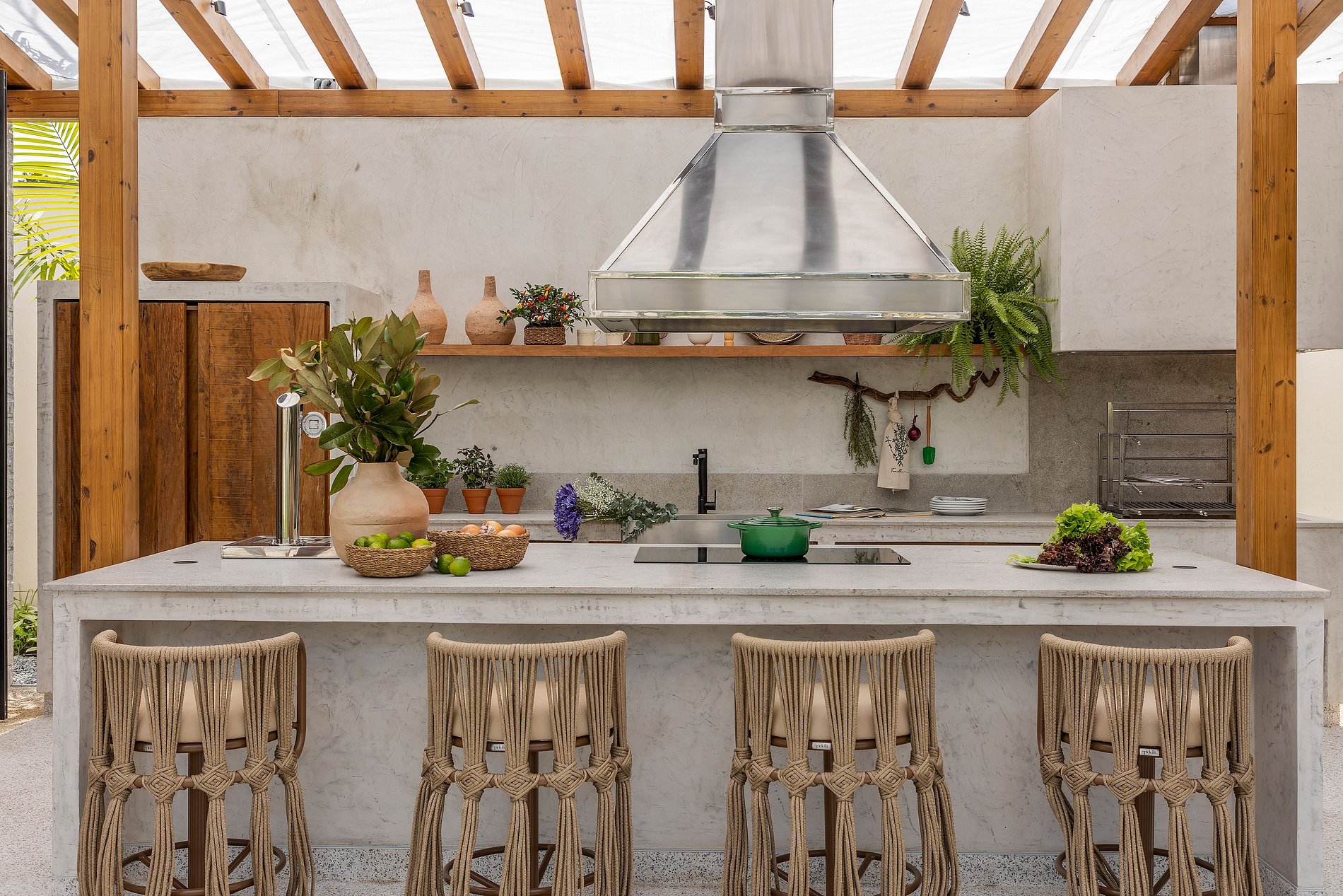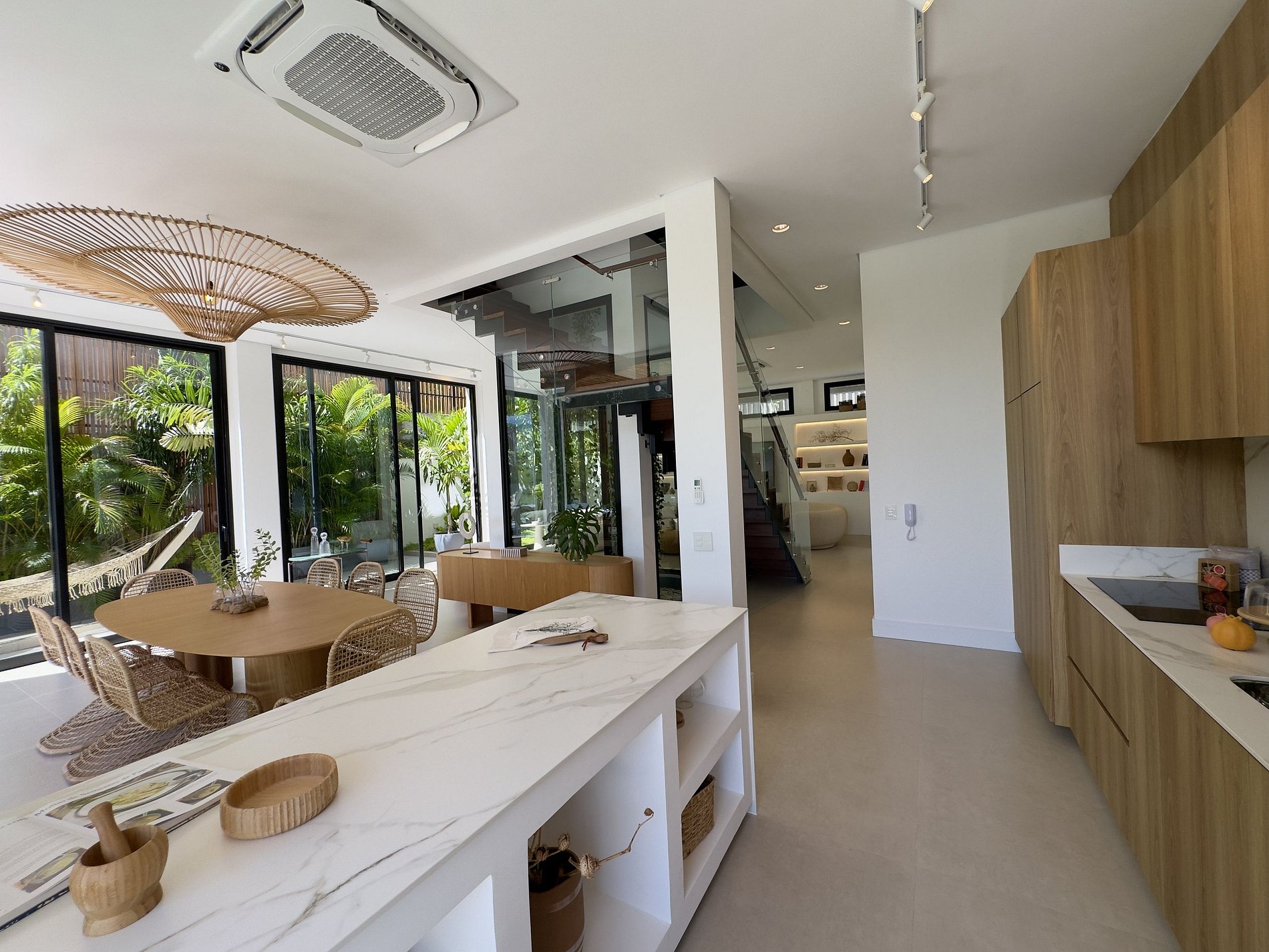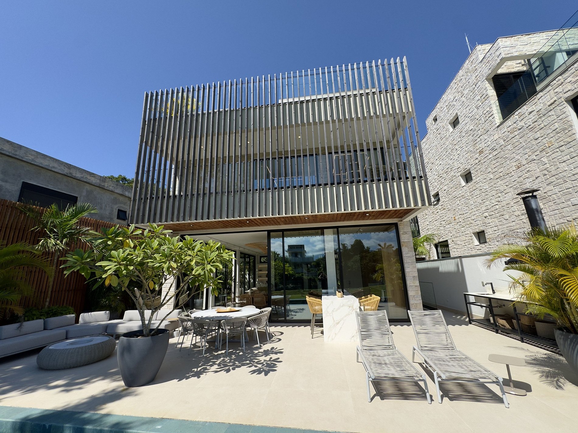 O paisagismo, assinado por Gil Fialho Paisagismo, BIU e Carla Oldemburg, apresenta um jardim sensorial com espécies que florescem em diferentes estações — um convite a apreciar a natureza o ano todo. O projeto inclui ainda árvores frutíferas e horta, pensado para proporcionar relaxamento em conexão com a natureza e a praia.