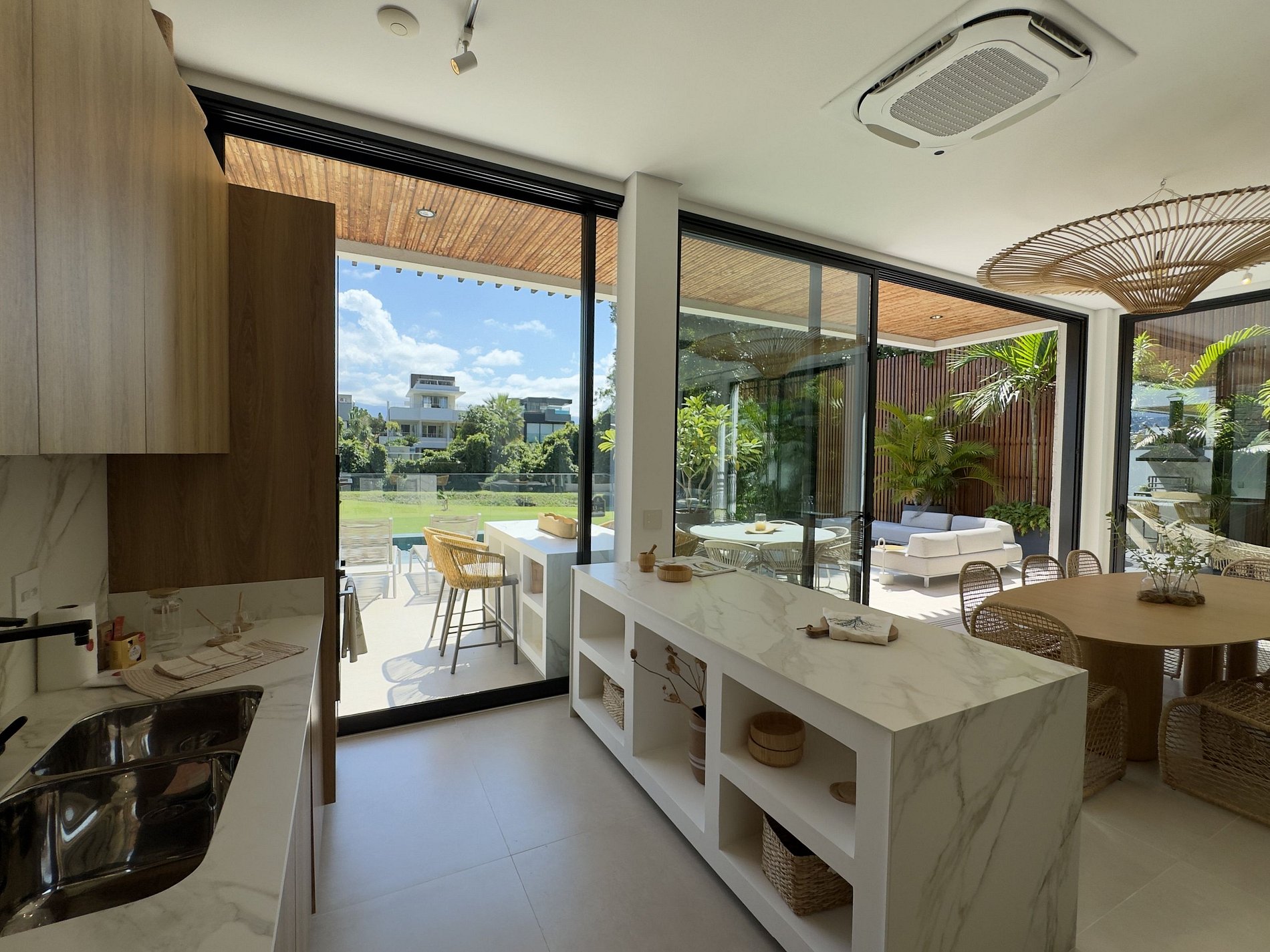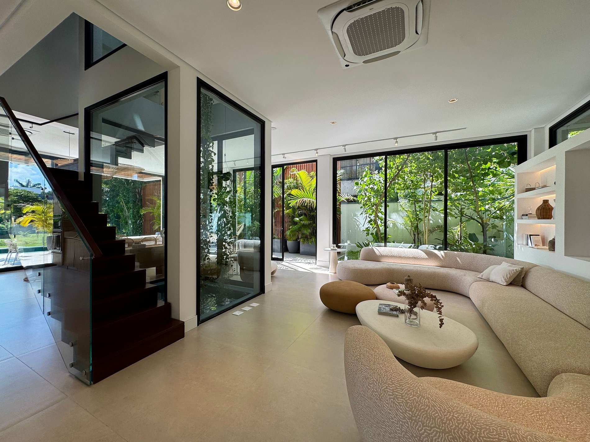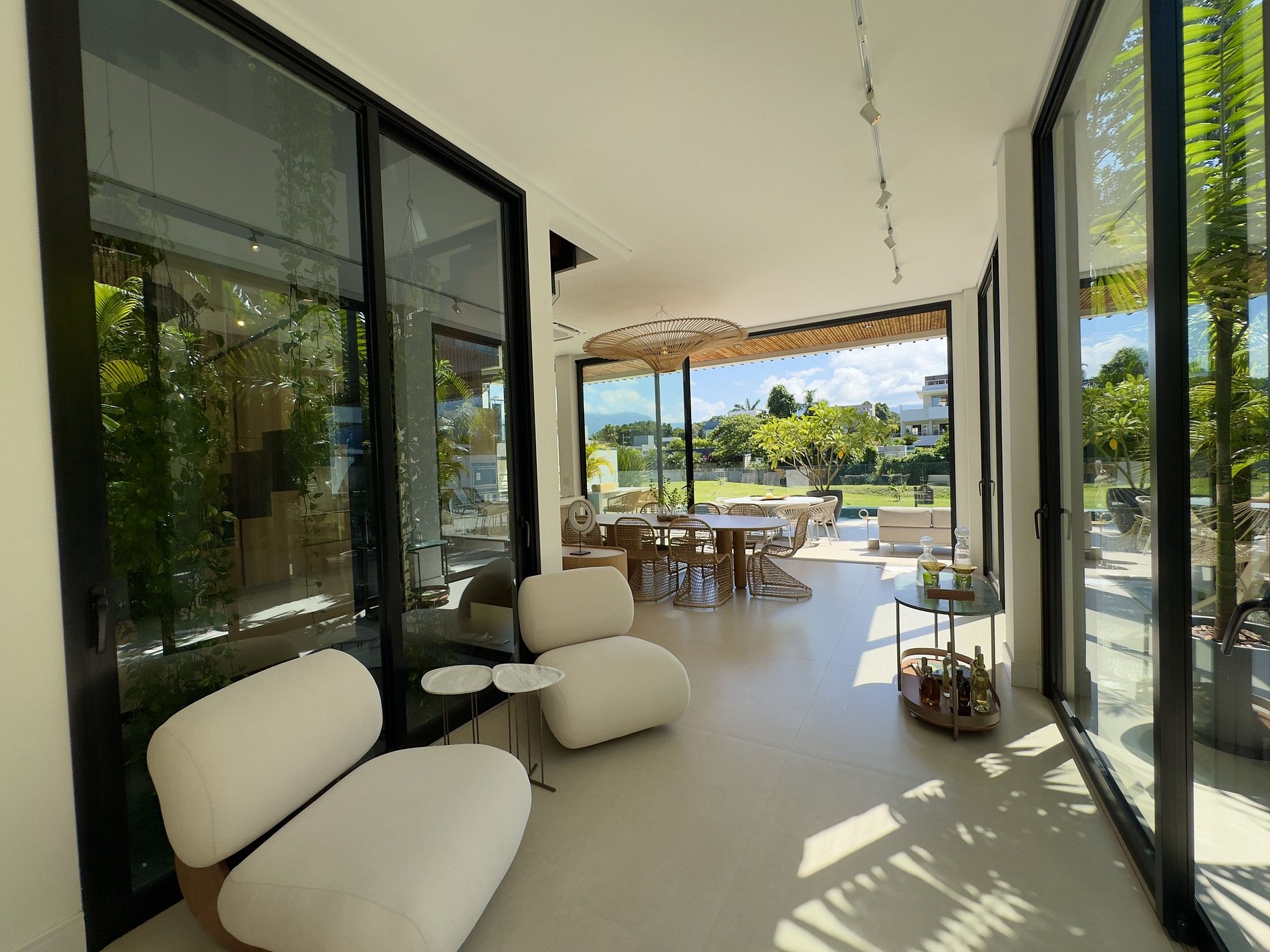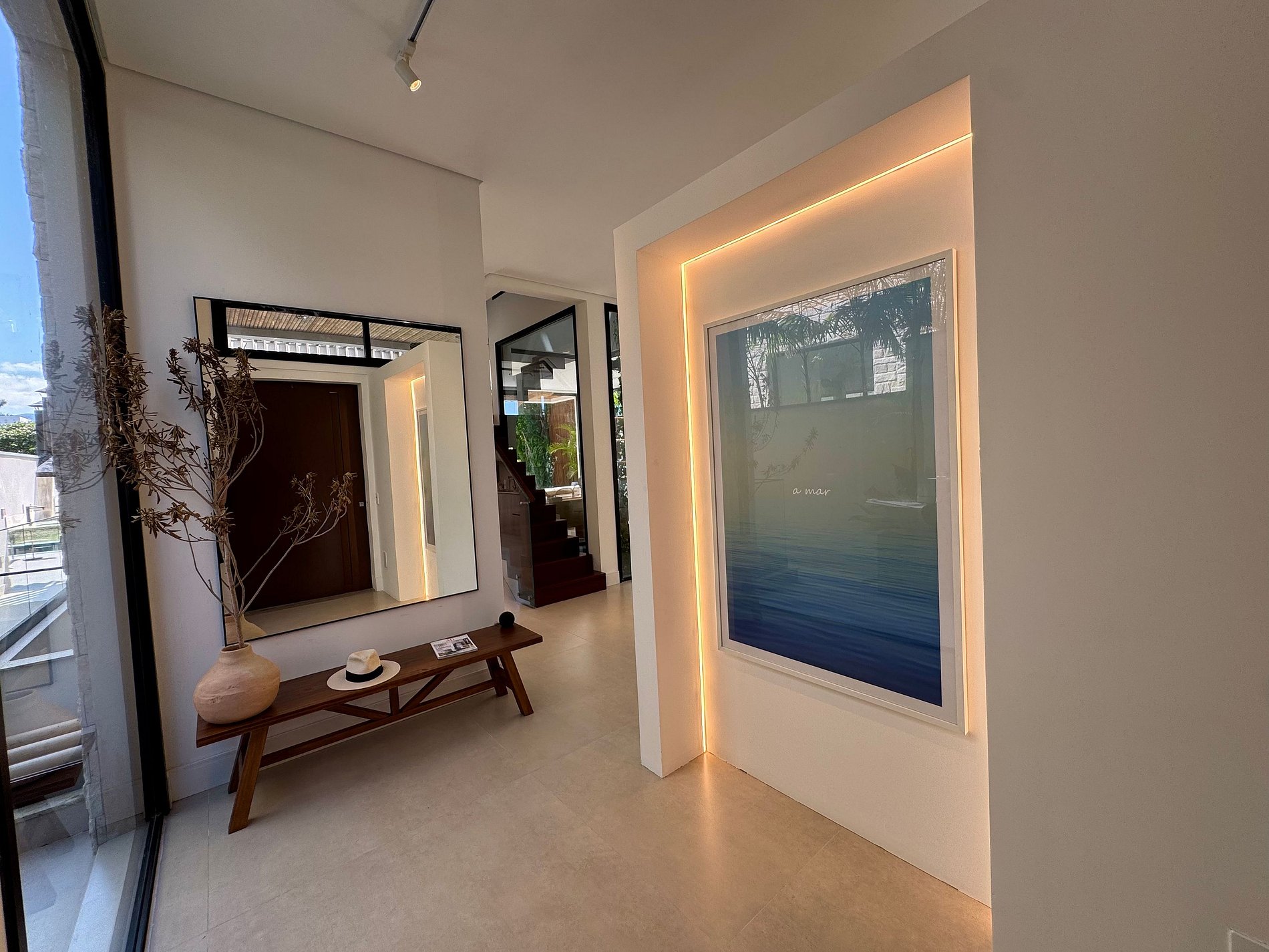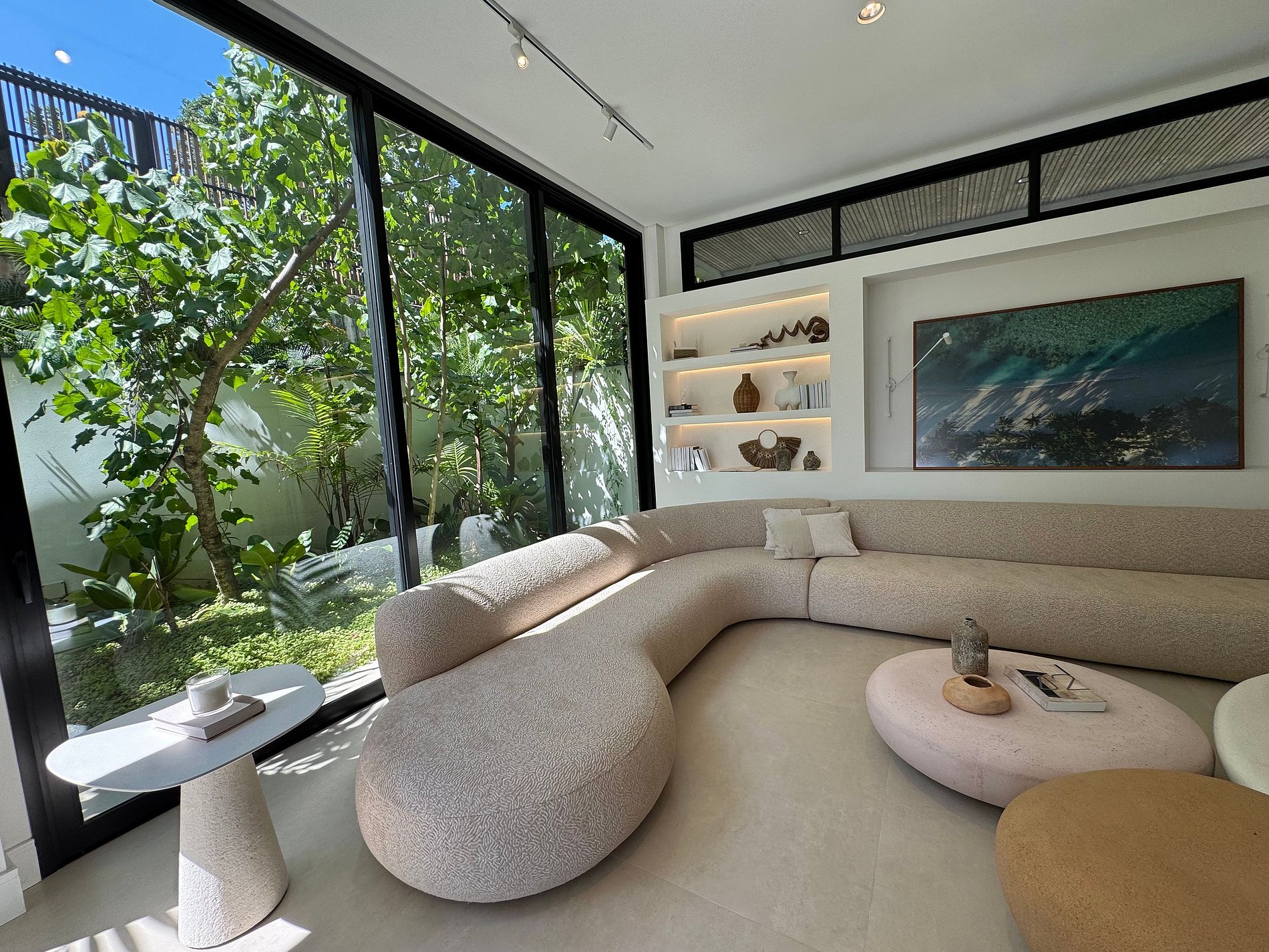 O paisagismo, assinado por Gil Fialho Paisagismo, BIU e Carla Oldemburg, apresenta um jardim sensorial com espécies que florescem em diferentes estações — um convite a apreciar a natureza o ano todo. O projeto inclui ainda árvores frutíferas e horta, pensado para proporcionar relaxamento em conexão com a natureza e a praia.
