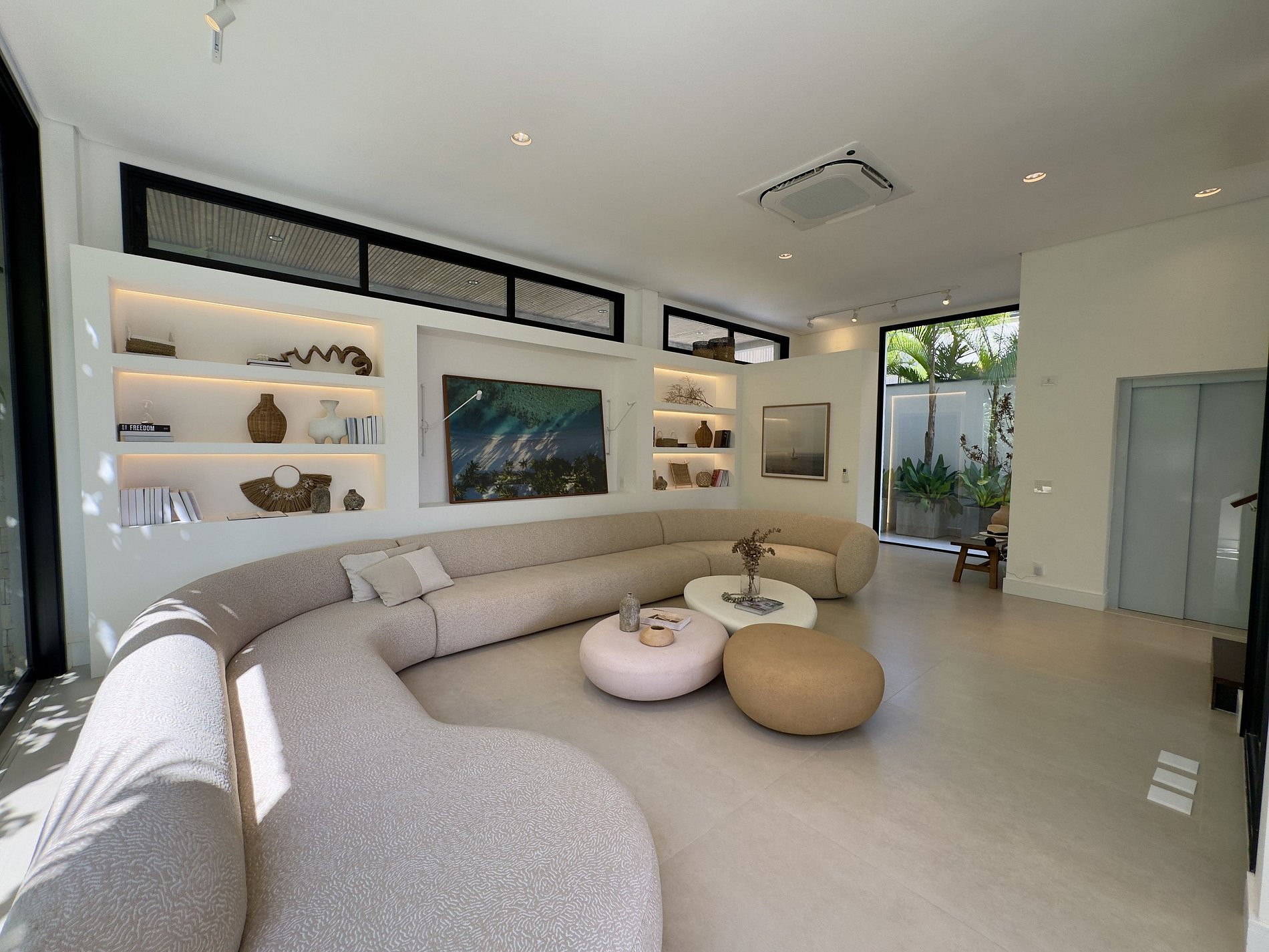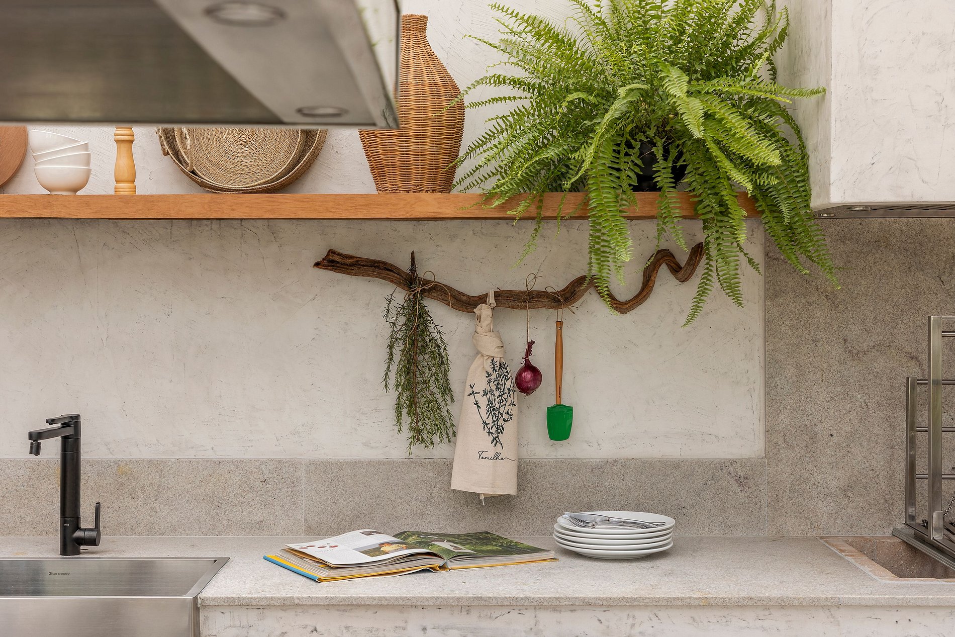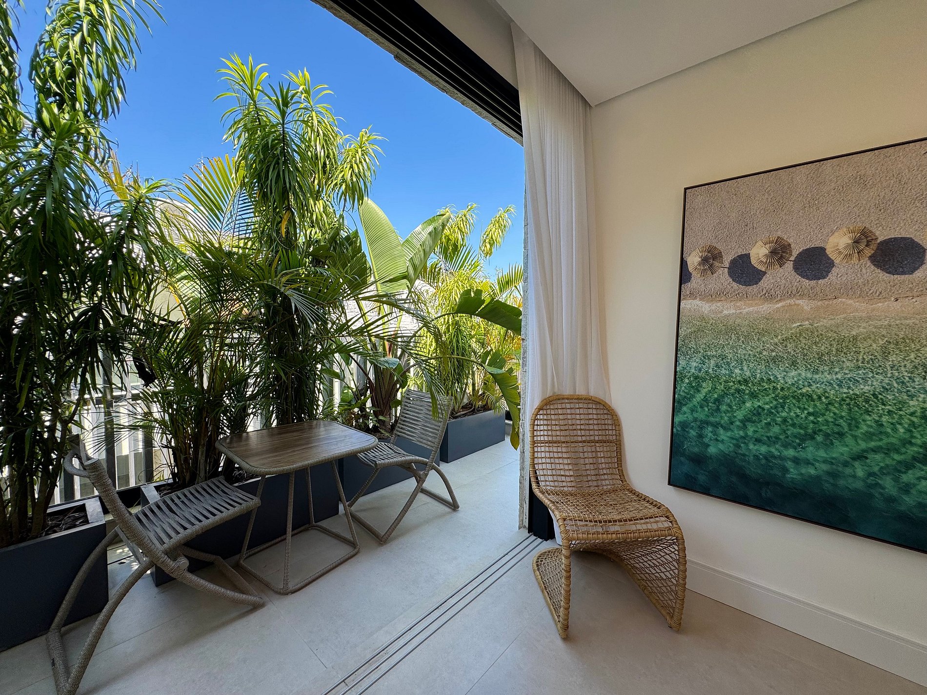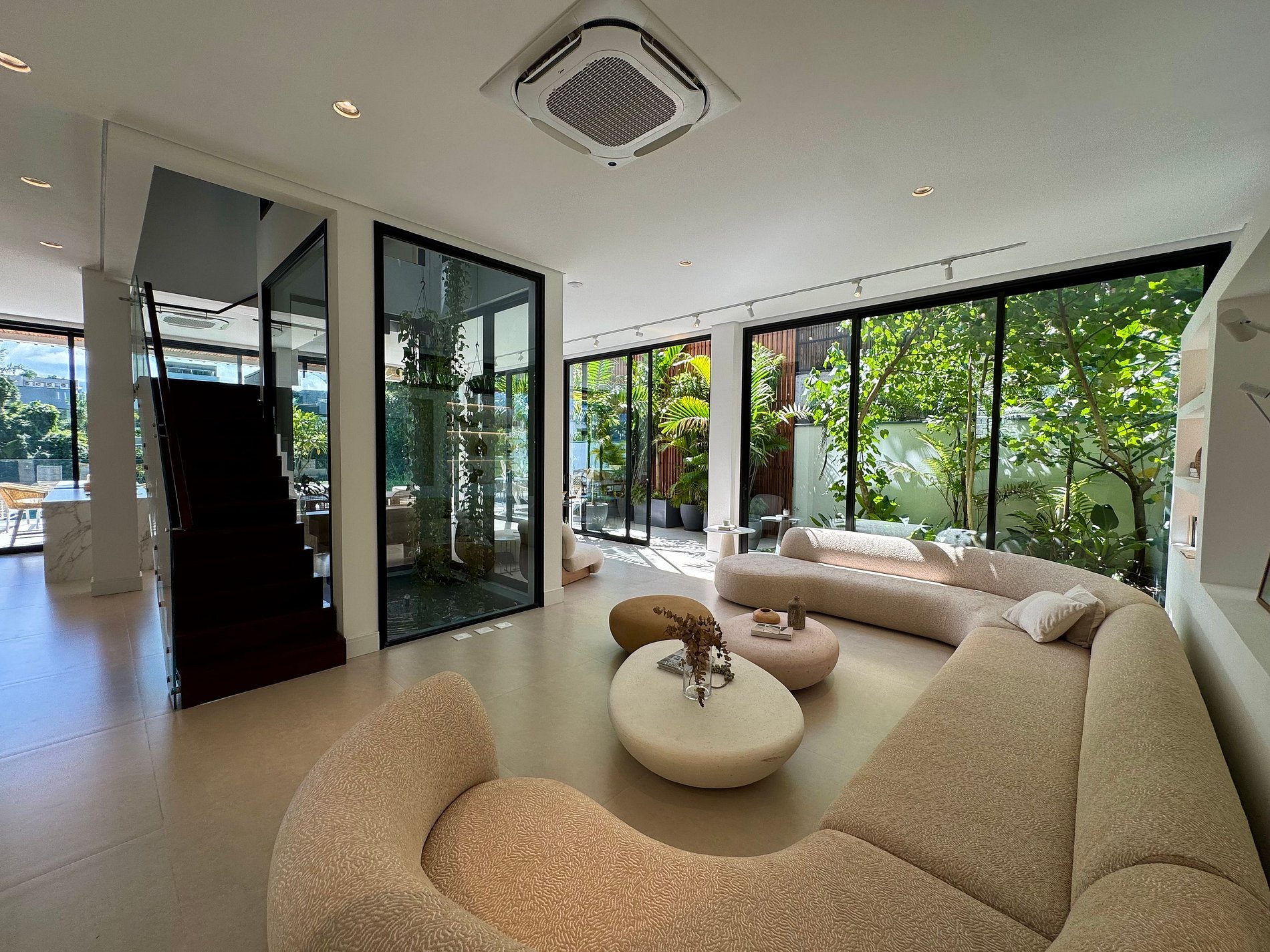 O paisagismo, assinado por Gil Fialho Paisagismo, BIU e Carla Oldemburg, apresenta um jardim sensorial com espécies que florescem em diferentes estações — um convite a apreciar a natureza o ano todo. O projeto inclui ainda árvores frutíferas e horta, pensado para proporcionar relaxamento em conexão com a natureza e a praia.