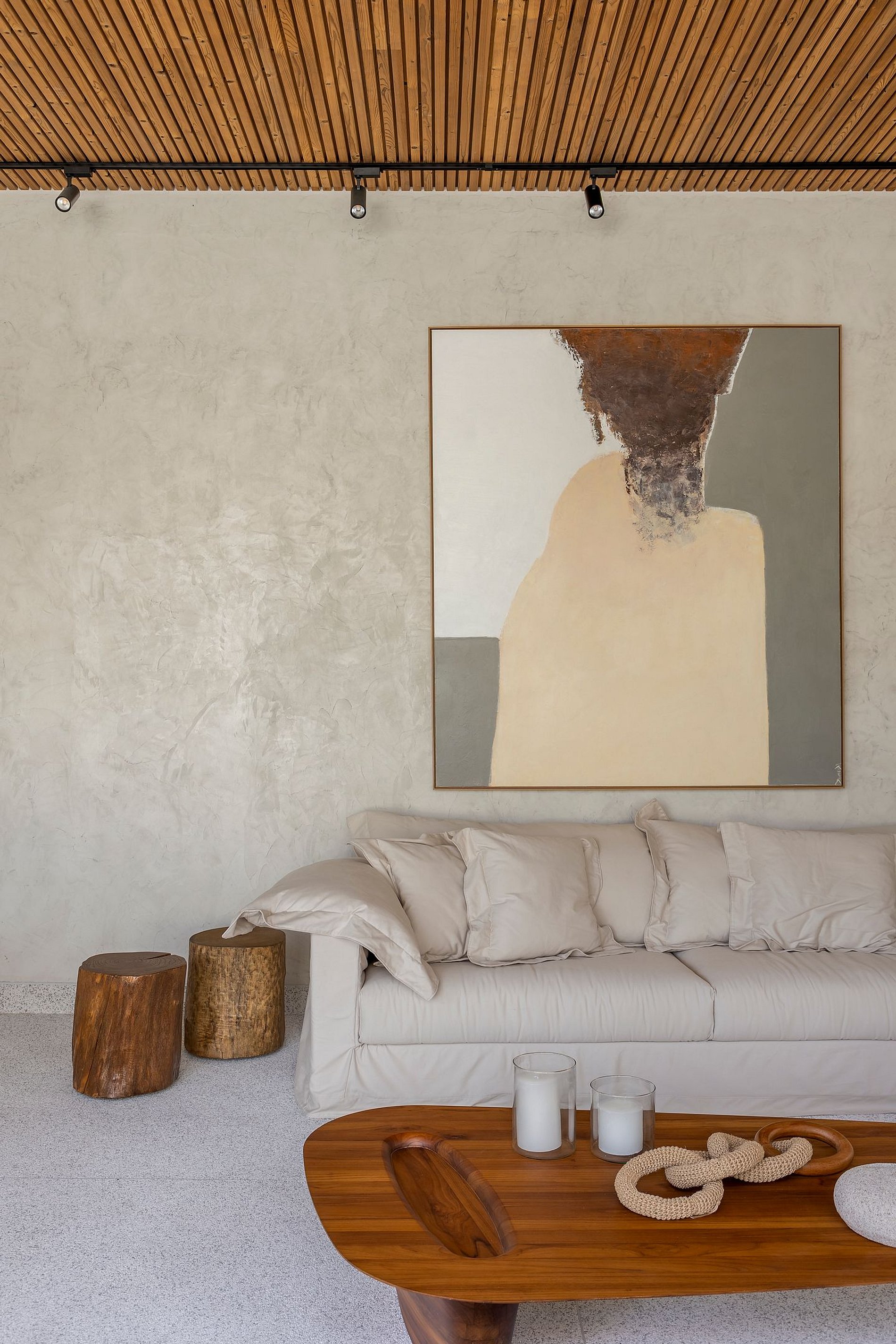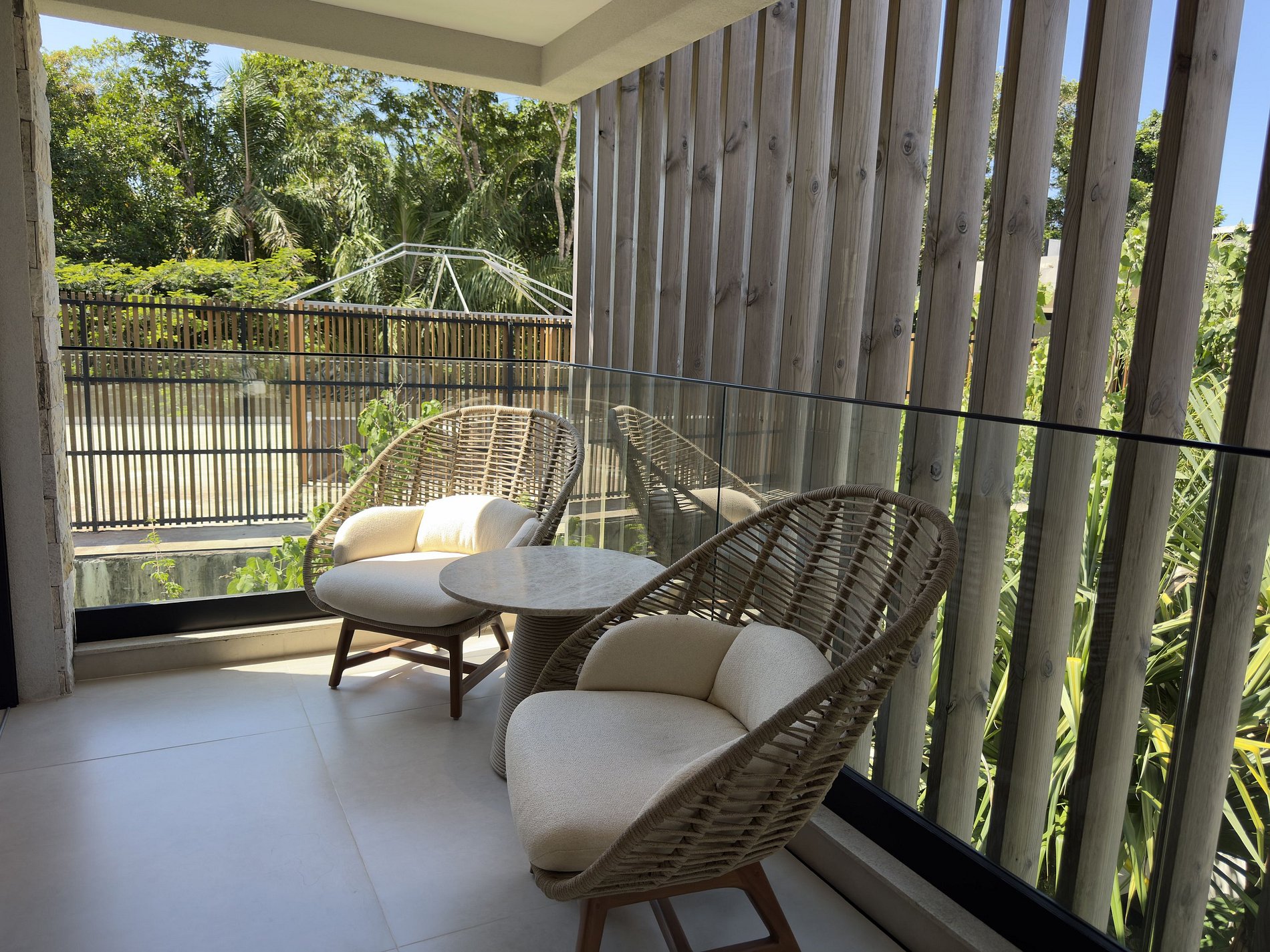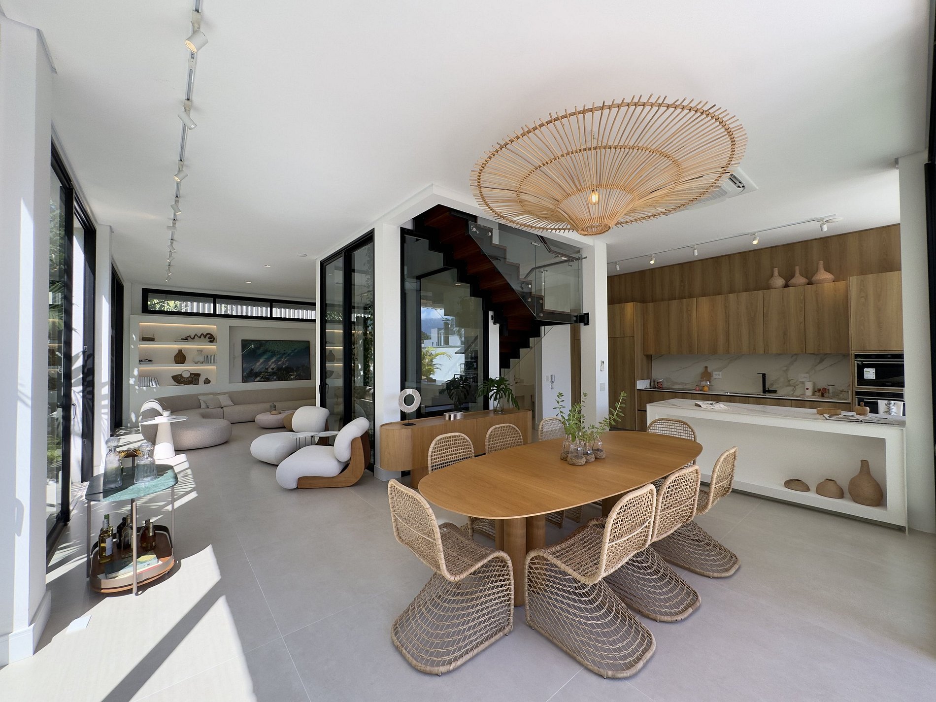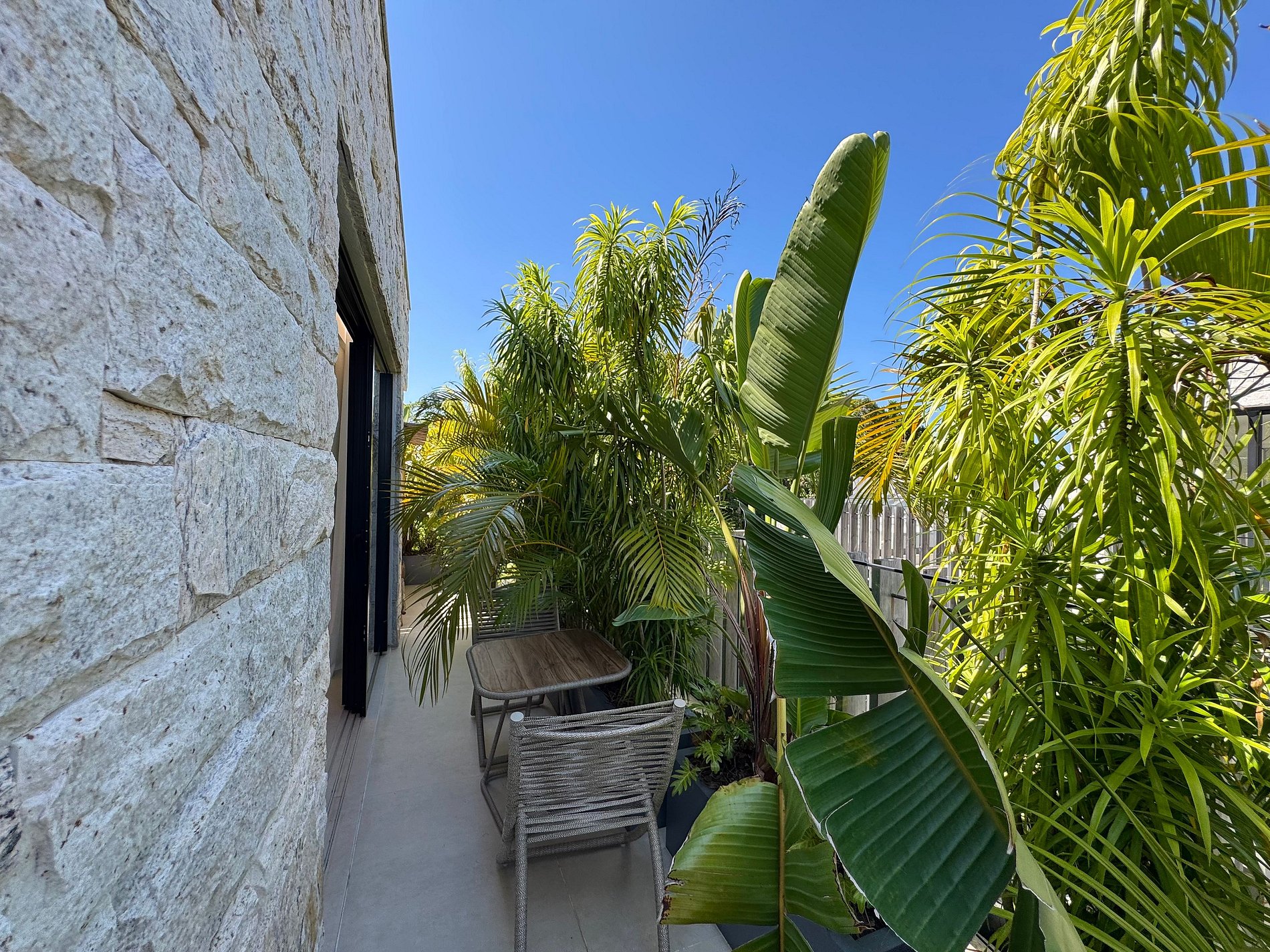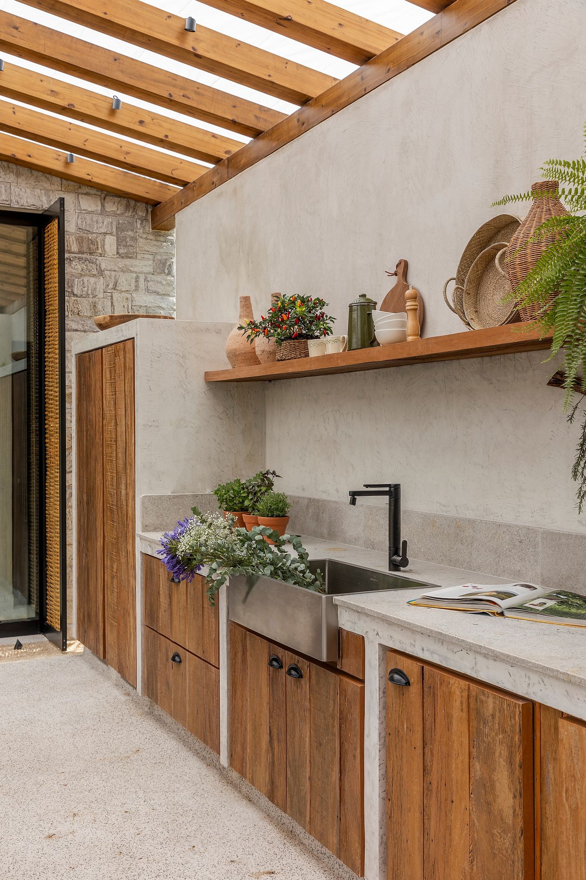 O paisagismo, assinado por Gil Fialho Paisagismo, BIU e Carla Oldemburg, apresenta um jardim sensorial com espécies que florescem em diferentes estações — um convite a apreciar a natureza o ano todo. O projeto inclui ainda árvores frutíferas e horta, pensado para proporcionar relaxamento em conexão com a natureza e a praia.