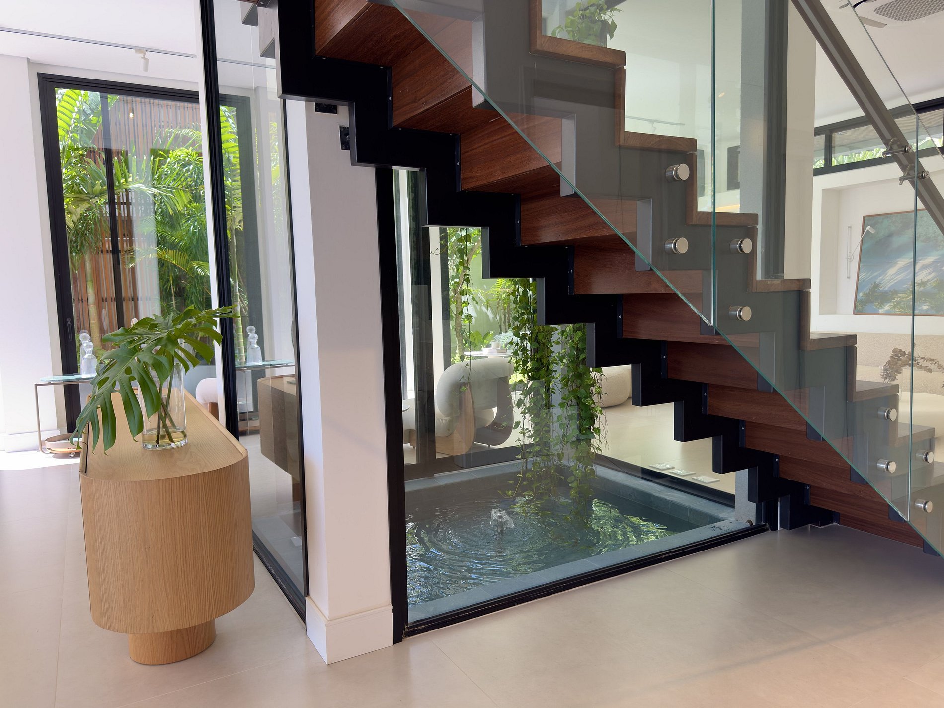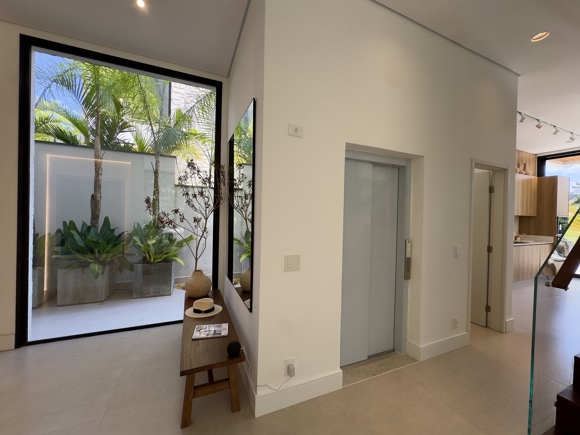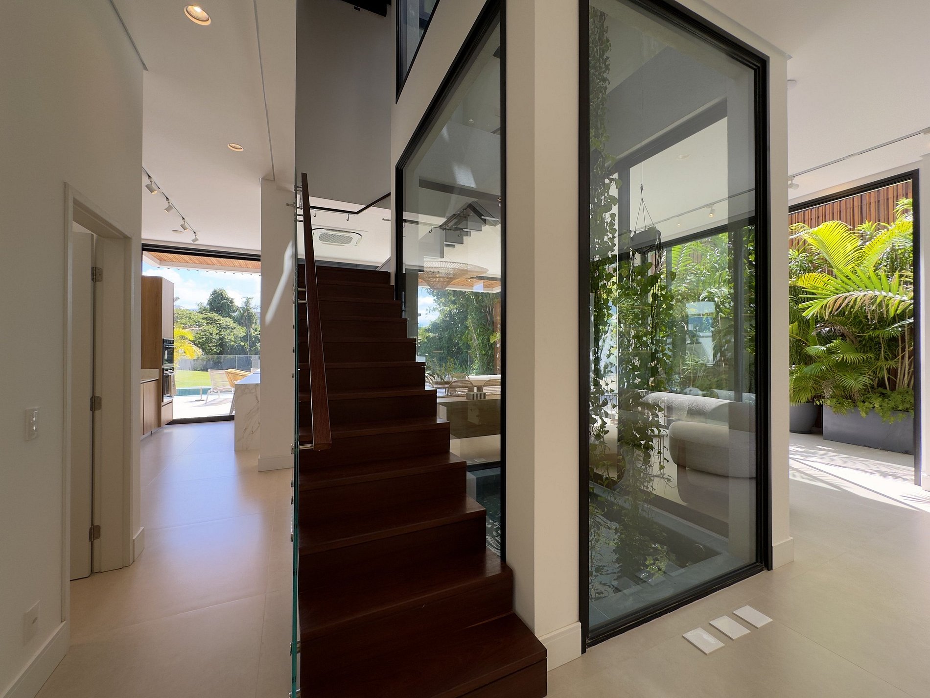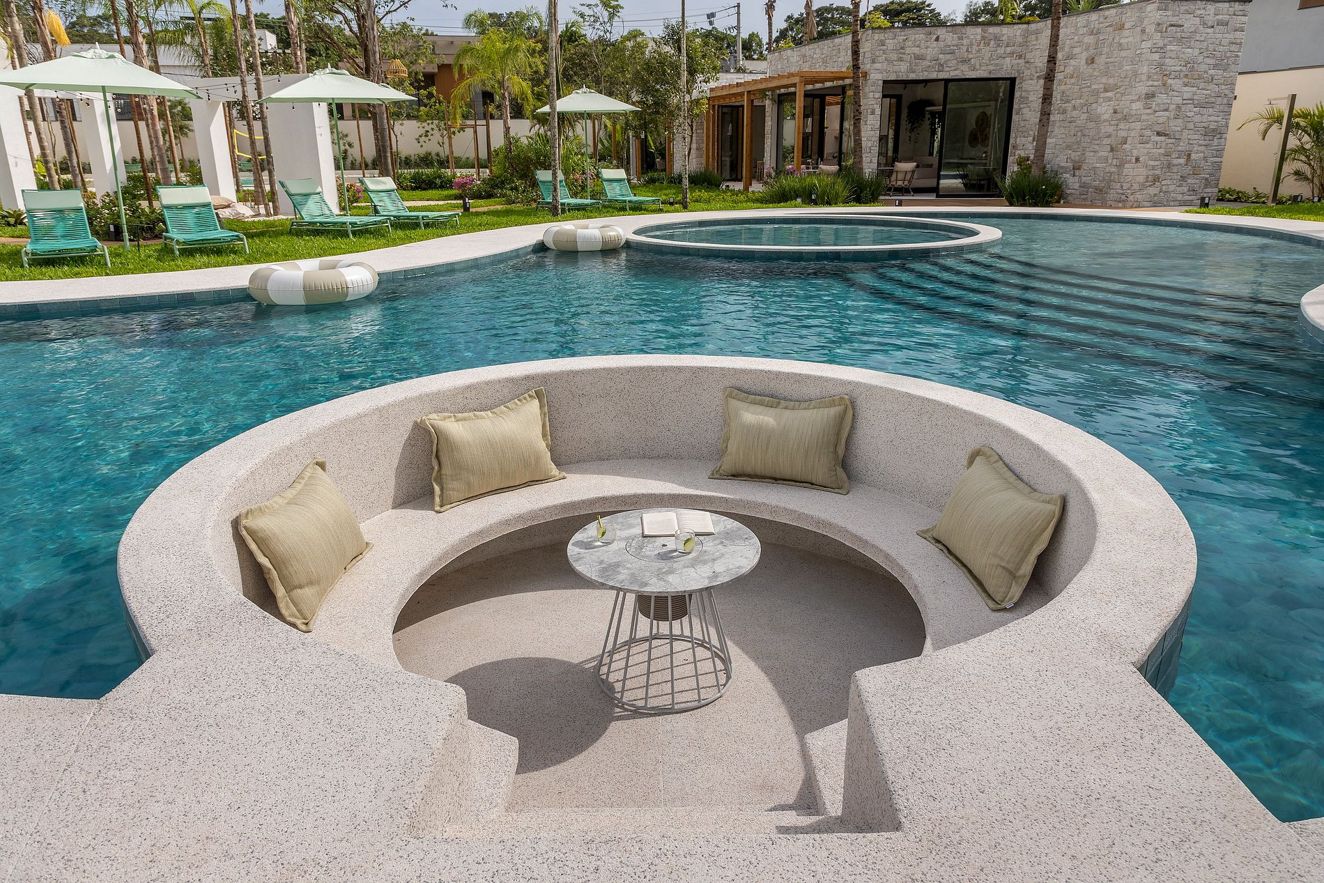 PAVIMENTO TÉRREO – Piscina privativa e churrasqueira, além de um espaço gourmet integrado à área externa. Um convite para aproveitar cada raio de sol com exclusividade. O átrio com espelho d’água e o paisagismo interno favorecem o clima e a luminosidade natural.
