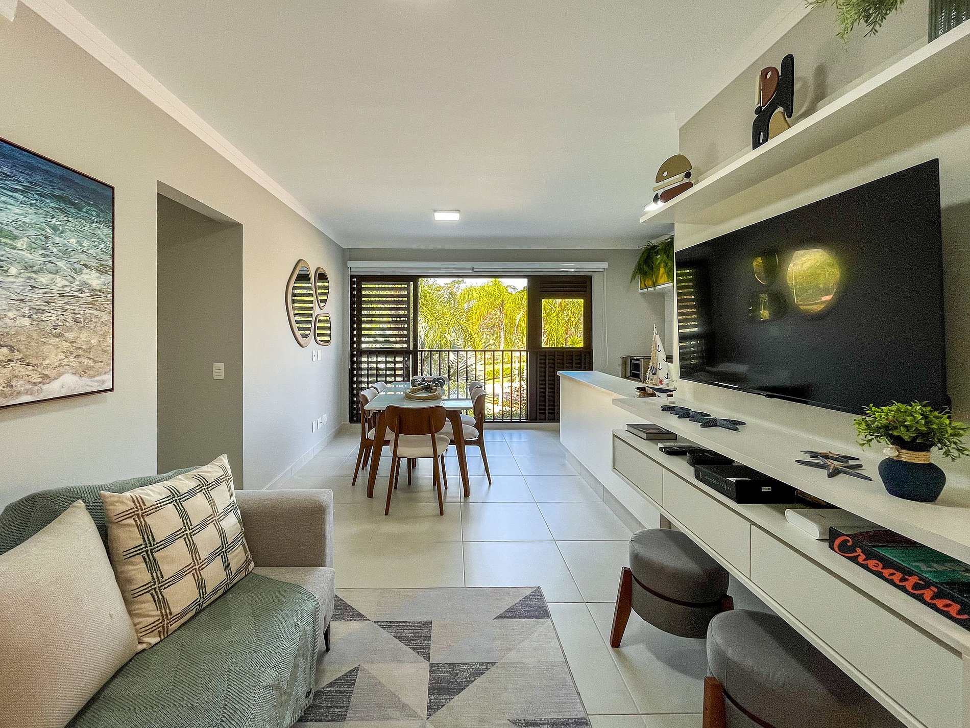 O apartamento é muito aconchegante, com decoração leve e elegante em cada detalhe. Todo esse capricho traz muito charme aos seus ambientes integrados, favorecendo a convivência e interação de todos. Uma energia incrível para seus momentos de descanso.